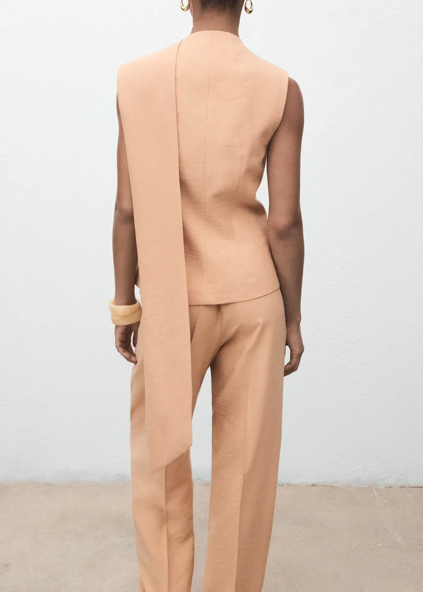 Wykonana z tkaniny lyocell bluzka ma asymetryczny krój i rękawy bez rękawów. Okrągły dekolt zdobi foulard. W zestawie znajdują się dopasowane spodnie, które nadają stylizacji bardziej elegancki wygląd