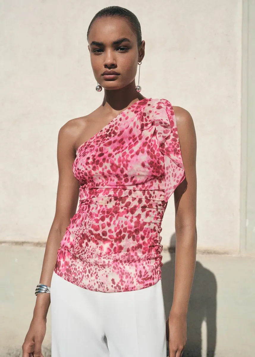 Ten top ma dopasowany krój i efektowny nadruk. Asymetryczny dekolt i szerokie ramiączka podkreślają detale w postaci supełków na ramionach. Ten model należy do naszej kolekcji eventowej, stworzonej z myślą o tym, abyś była idealną gościem na każdej imprezie, weselu lub uroczystości.