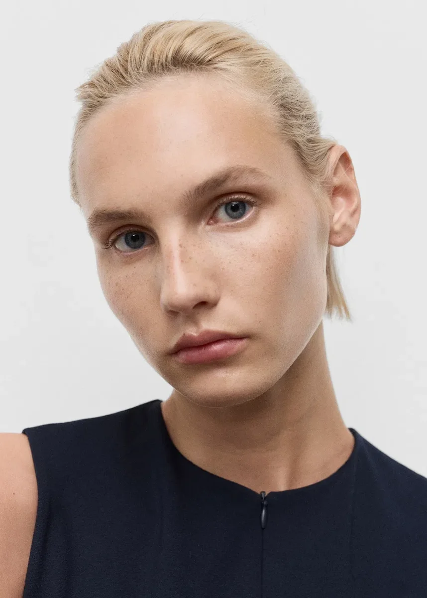 Dopasowany krój. Okrągły dekolt. Bez rękawów. Szerokie ramiączka. Zamek błyskawiczny z przodu. Całościowy wygląd