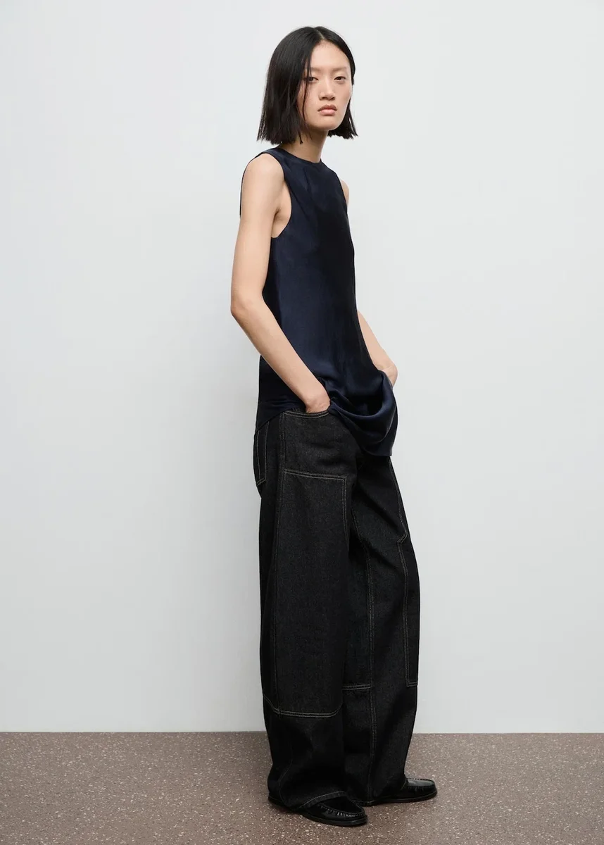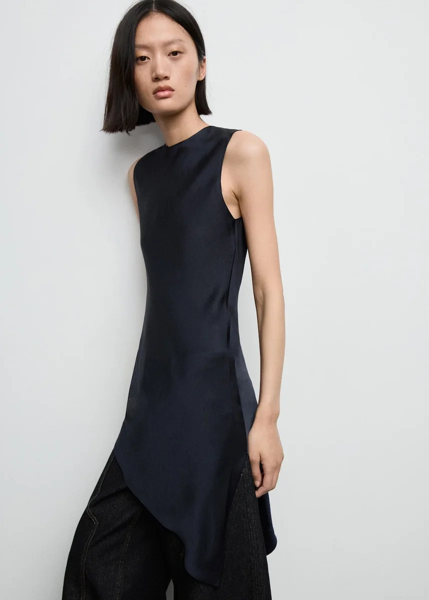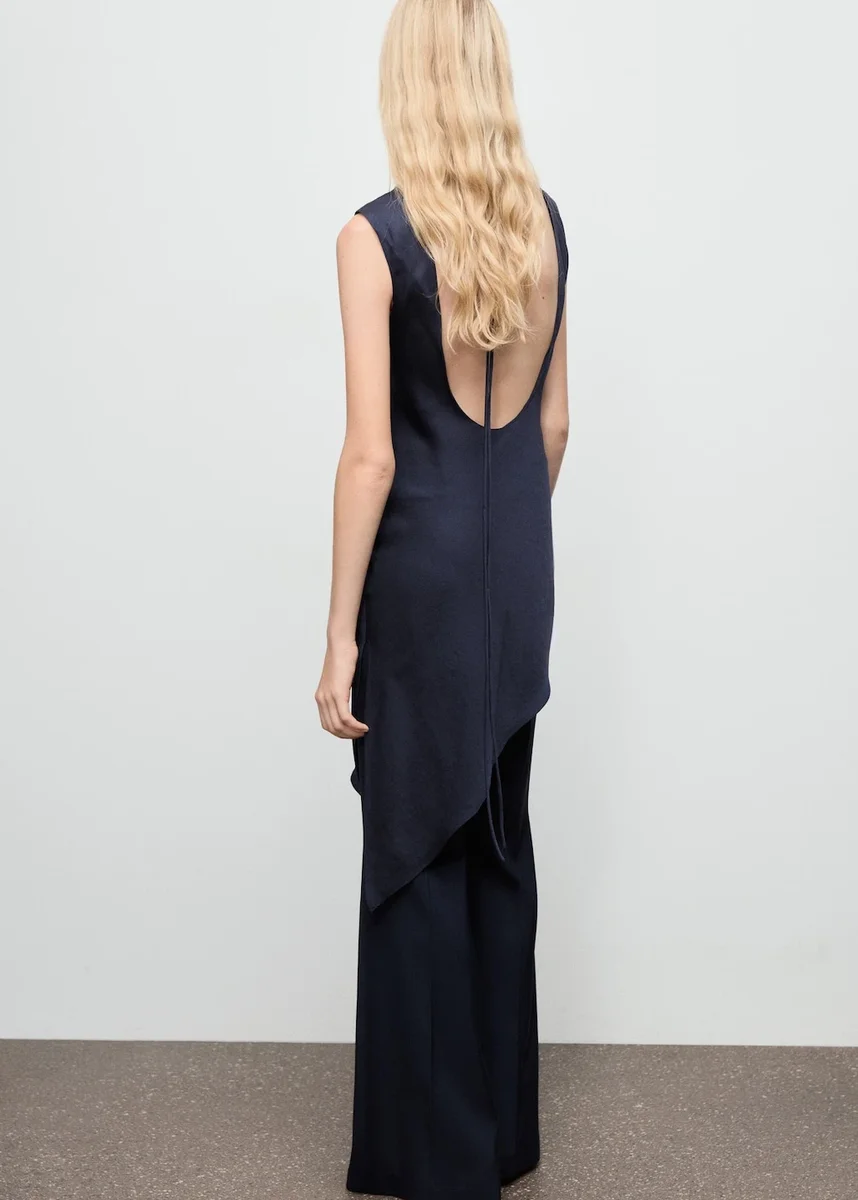 Wykonana z satyny, ta długa, asymetryczna sukienka ma okrągły dekolt i rękawy bez rękawów. Otwarte plecy i rozcięcie z boku dodają jej wyjątkowego charakteru. Wiązanie pod szyją dopełnia całości. Modele w kolorze czarnym i granatowym są dostępne wyłącznie w sprzedaży internetowej. Ta sukienka należy do naszej kolekcji okolicznościowej, zaprojektowanej tak, abyś była idealną gościem na każdej imprezie, weselu lub uroczystości.
