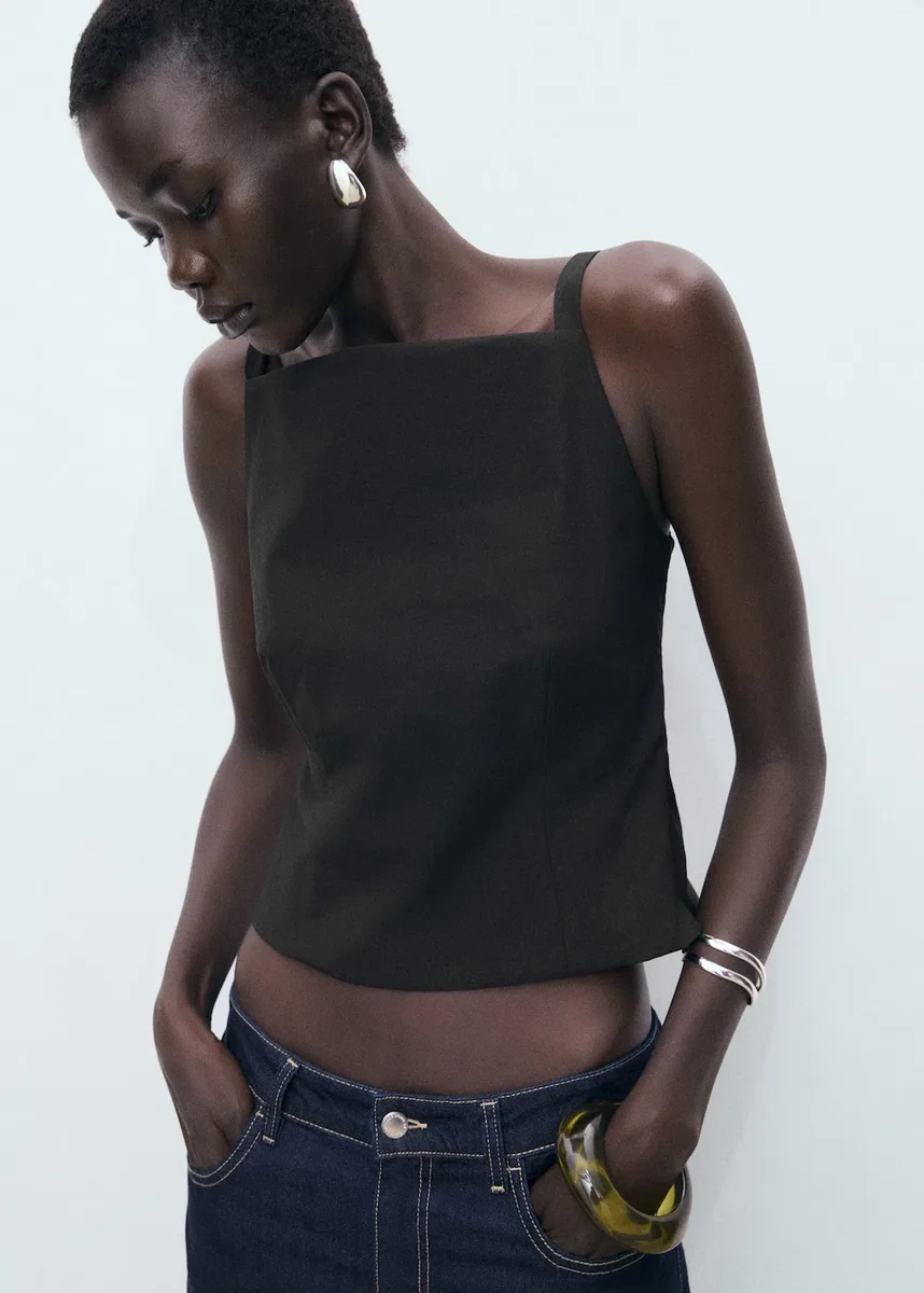 Ta bluzka o prostym kroju i eleganckim kwadratowym dekolcie ma z tyłu ozdobne wiązania, które dodają jej kobiecego charakteru. Dopasowana w górnej części i lekko luźna w dolnej, ta bluzka jest uniwersalnym elementem garderoby, idealnym zarówno na co dzień, jak i na bardziej formalne okazje.