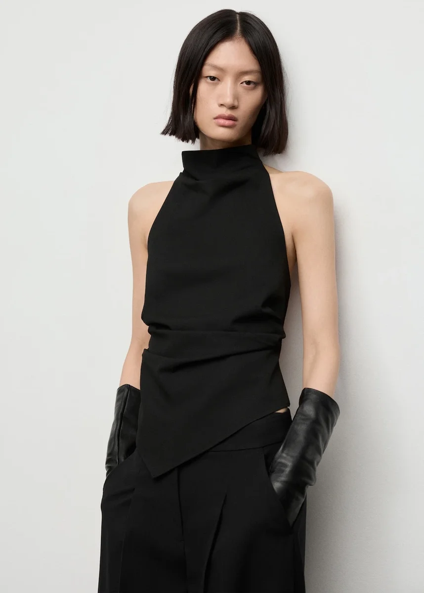 Prosty krój. Sznurki na szyi. Drapowana szyja. Bez rękawów. Otwarty tył z ramiączkami. Asymetryczny dół. Zapięcie na guziki przy szyi. Ta część garderoby należy do naszej kolekcji imprezowej i okolicznościowej, zaprojektowanej, aby podkreślić Twój wygląd podczas specjalnych okazji.
