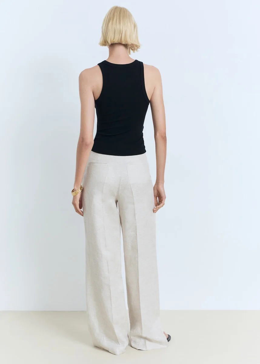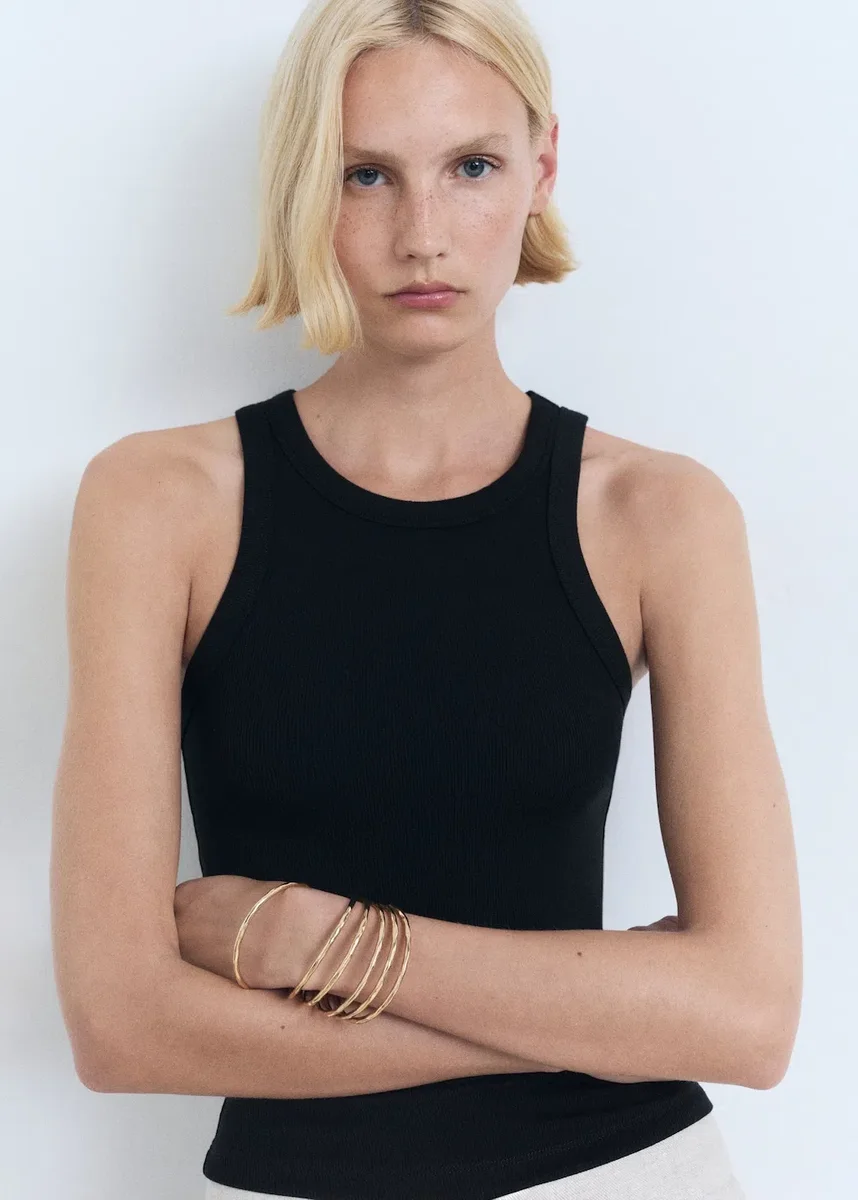 Wykonana z prążkowanej tkaniny, ta dopasowana bluzka ma elegancki dekolt halter i szerokie ramiączka. Bez rękawów i zapięcia, zapewnia komfort i styl w jednym. Dostępna w rozmiarze plus size