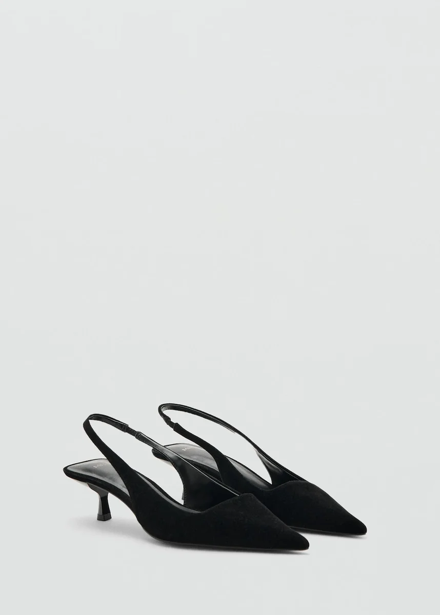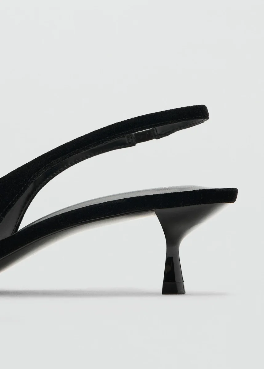 Aksamitna tkanina. Konstrukcja typu slingback. Szpiczasty nosek. Niski obcas. Obcas o wysokości 1,97 cala. Bez zapięcia