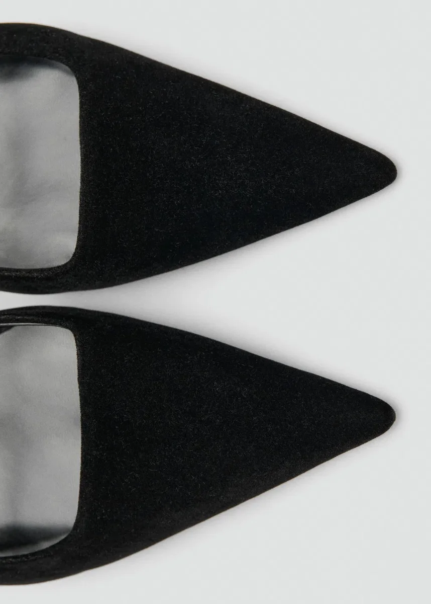 Aksamitna tkanina. Fason z paskiem. Szpiczasty nosek. Niski obcas. Obcas o wysokości 1,97 cala. Bez zapięcia