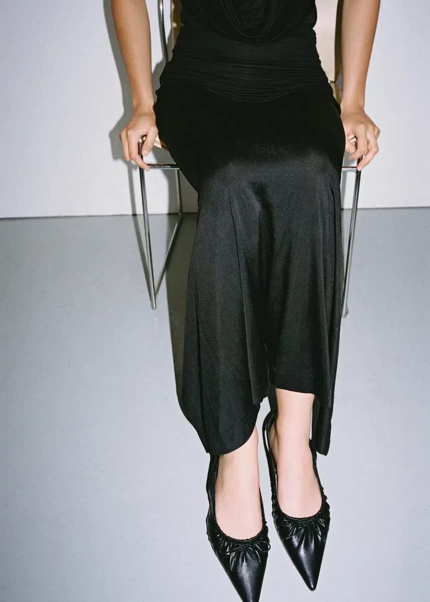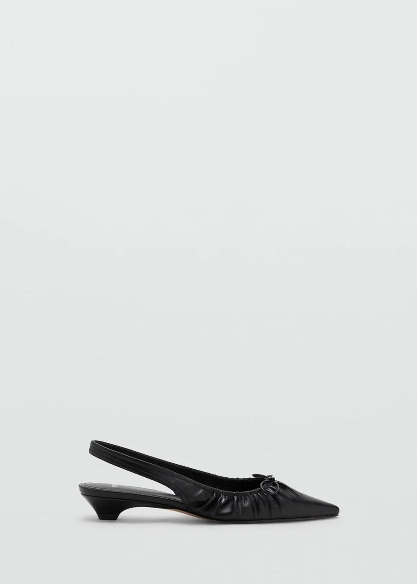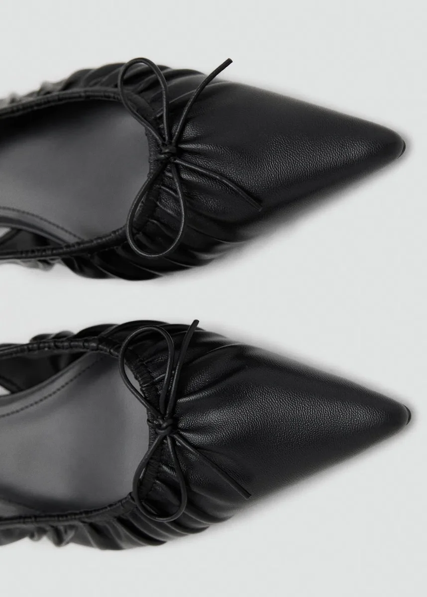 Model z paskiem z tyłu. Marszczona tkanina. Szpiczasty nosek. Kokardka. Niski obcas. Obcas o wysokości 3,5 cm. Bez zapięcia. Produkt dostępny wyłącznie online