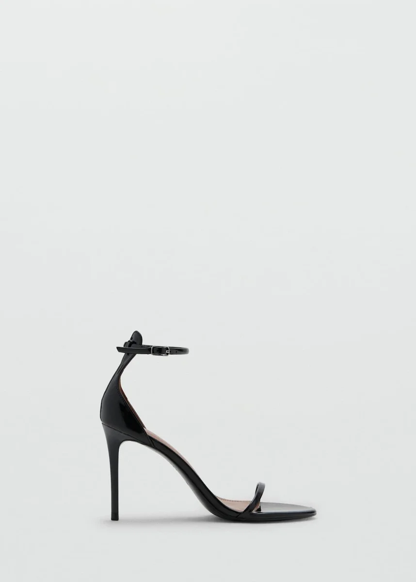Efekt lakierowanej skóry. Paski. Otwarty palec. Szpilka. Zapięcie na kostce z metalową klamrą. Obcas 3,74 cala.