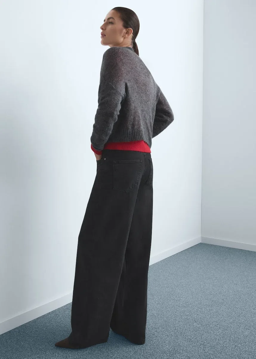 Bawełniana tkanina dżinsowa. Długi fason. Szerokie nogawki. Średni stan. Szlufki. Pięć kieszeni. Zapięcie z przodu na guziki, haczyki i zamek błyskawiczny