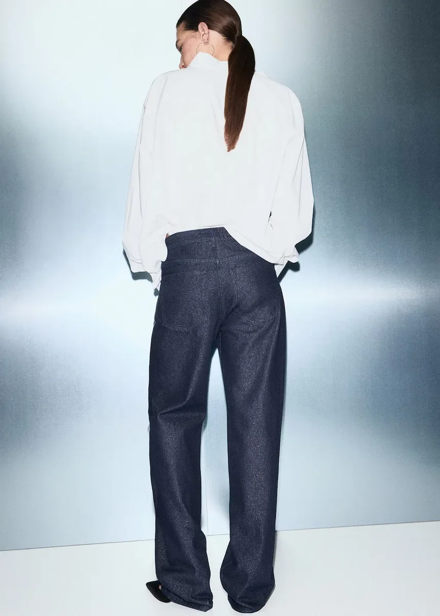 Bawełniana tkanina dżinsowa. Tkanina z brokatem. Długi krój. Prosty krój. Średni stan. Szlufki. Pięć kieszeni. Zapięcie na zamek błyskawiczny i guzik. Podszewka wewnętrzna. Długość nogawki 84 cm.