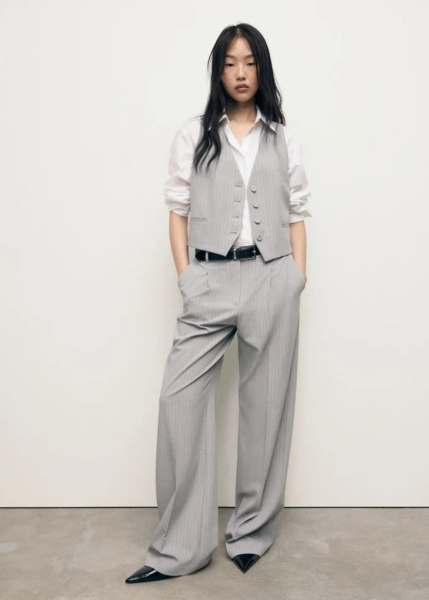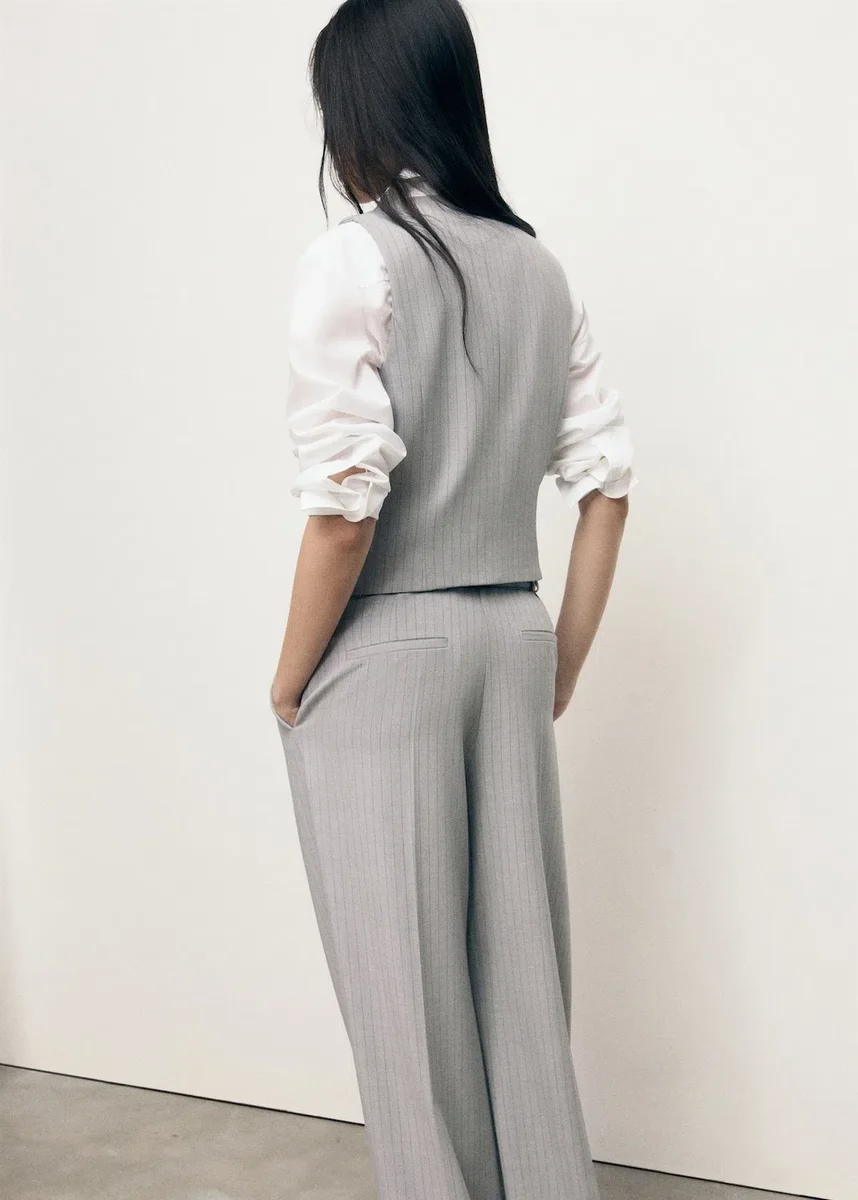 Ta kamizelka o prostym kroju i wzorze w prążki ma dekolt w szpic i szerokie ramiączka. Posiada dwie kieszenie z przodu i zapięcie na guziki. W zestawie znajduje się dopasowana marynarka i spodnie. Dostępna w rozmiarze Plus Size