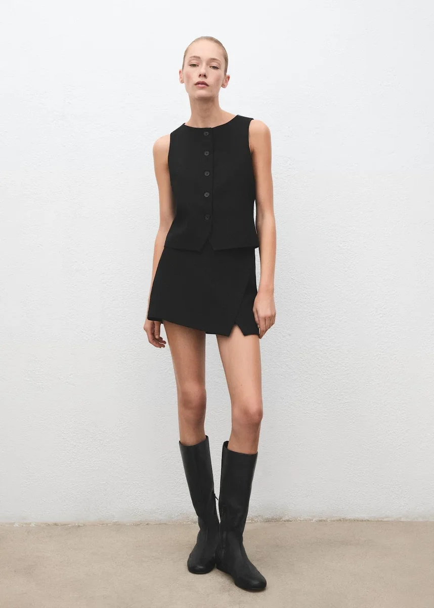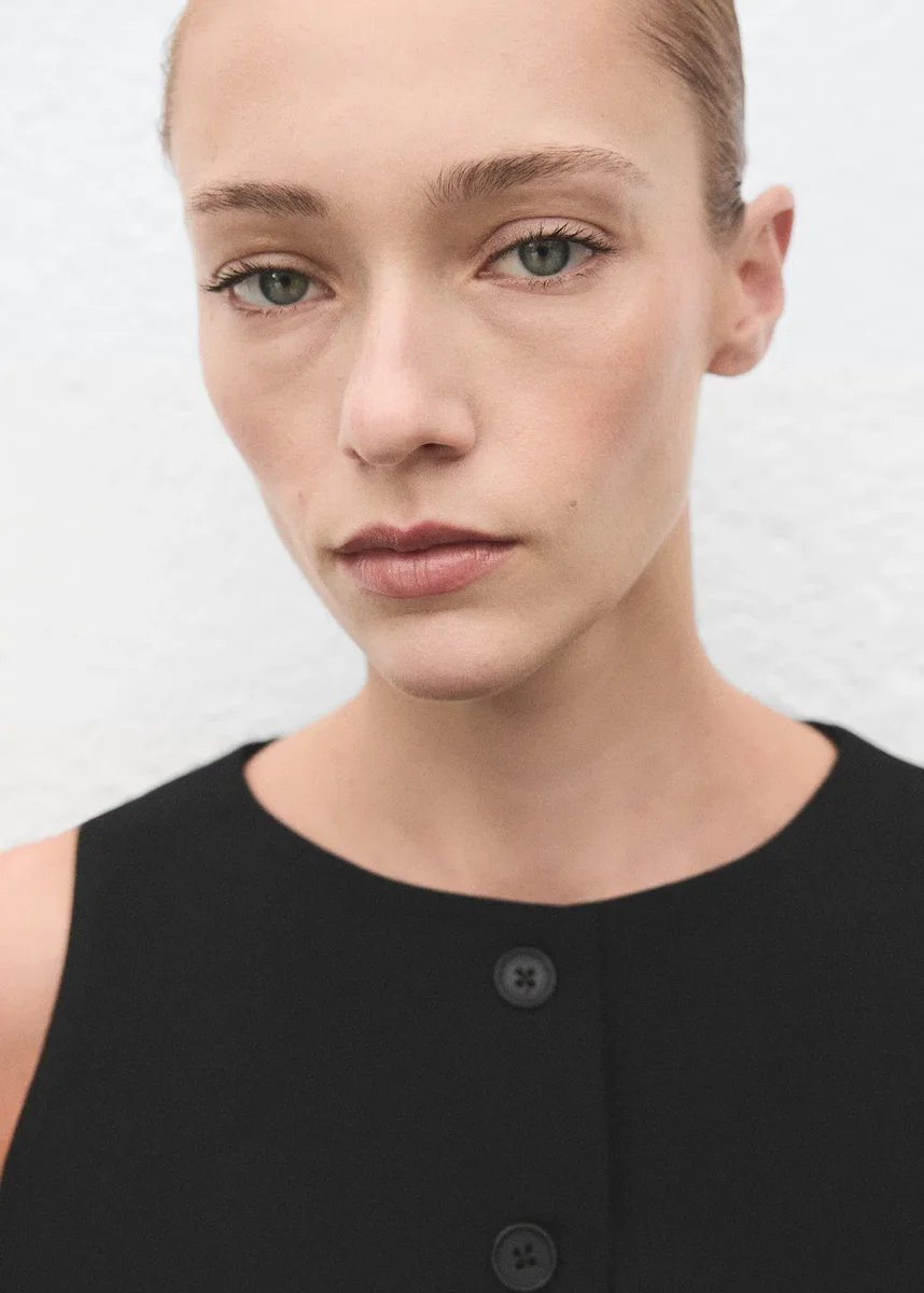 Prosty krój. Okrągły dekolt. Bez rękawów. Szerokie ramiączka. Zapięcie na guziki z przodu. Podszewka wewnętrzna. Całkowity wygląd. Czarny piątek