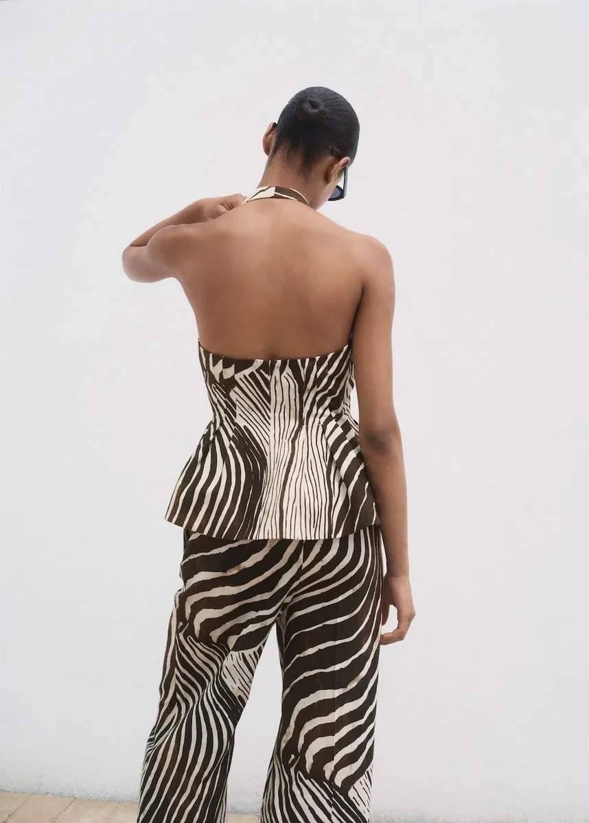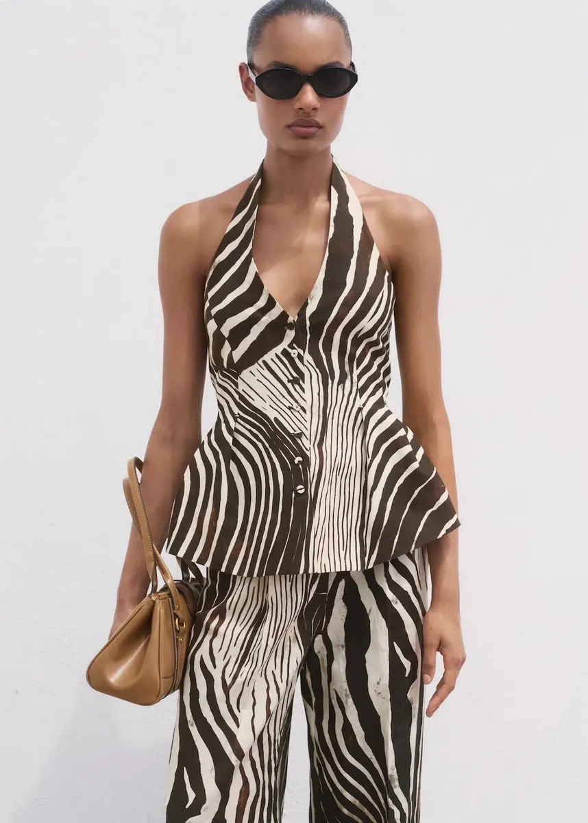 Ta kamizelka, wykonana z mieszanki lnu i bawełny, ma krój z falbaną i nadruk w zebrę. Ma dekolt typu halter i cienkie ramiączka. W zestawie znajdują się dopasowane spodnie, które pozwalają stworzyć kompletną stylizację.