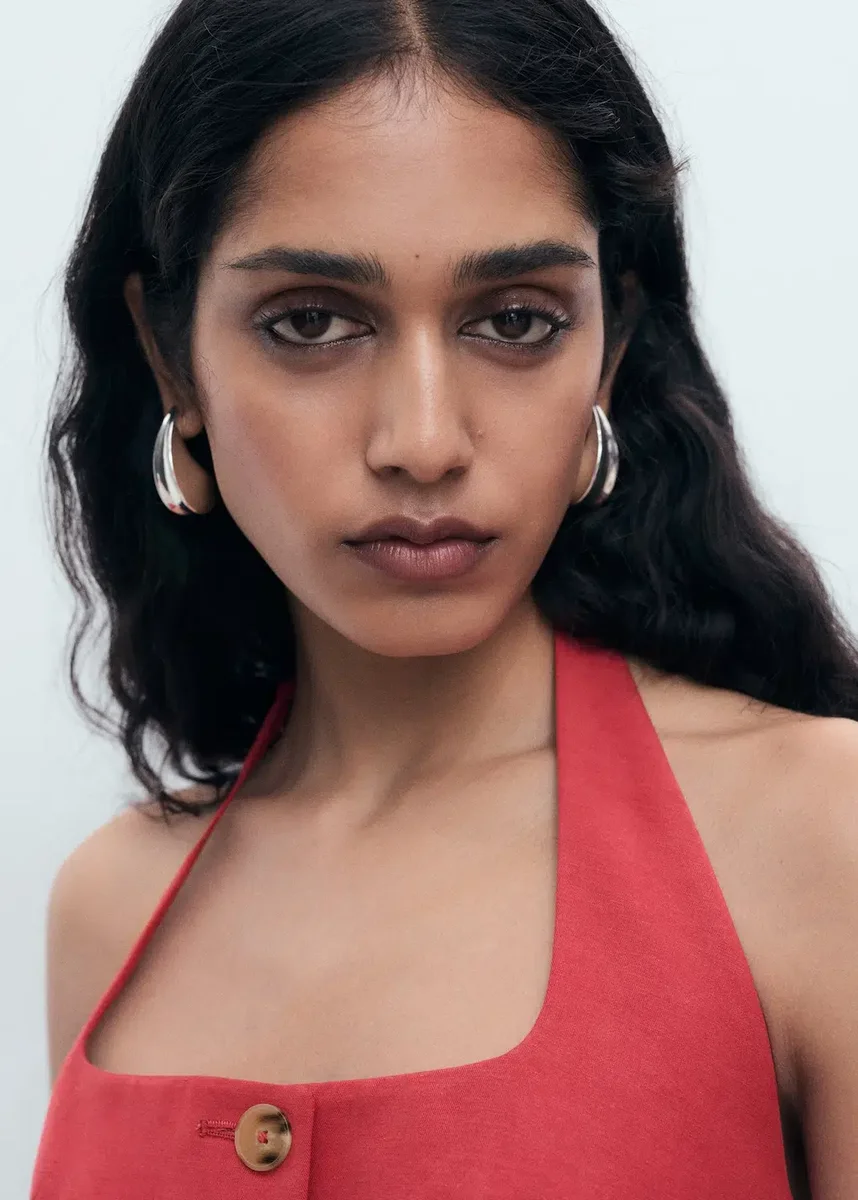 Mieszanka lnu i lyocellu. Fason garniturowy. Prosty krój. Niski dekolt. Dekolt typu halter. Dwie boczne kieszenie z klapkami. Zapięcie na guziki z przodu. Całościowy look. Kolor czerwony jest dostępny wyłącznie w sprzedaży internetowej.