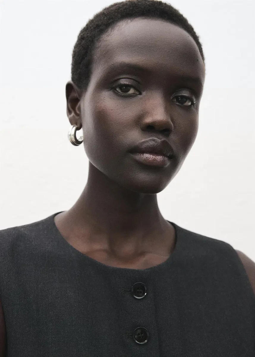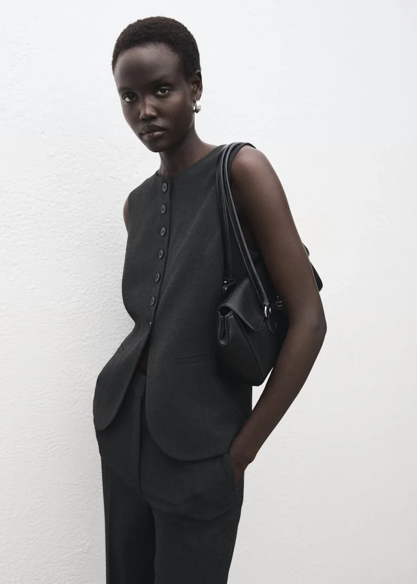 Krój garniturowy. Prosty krój. Okrągły dekolt. Bez rękawów. Zapięcie na guziki z przodu. Całościowy wygląd