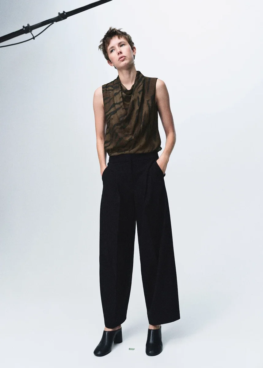 Prosty krój. Nadruk zwierzęcy. Drapowany kołnierz. Szerokie ramiączka. Dół z dwoma rozcięciami po bokach. Zapięcie na zamek błyskawiczny z tyłu.