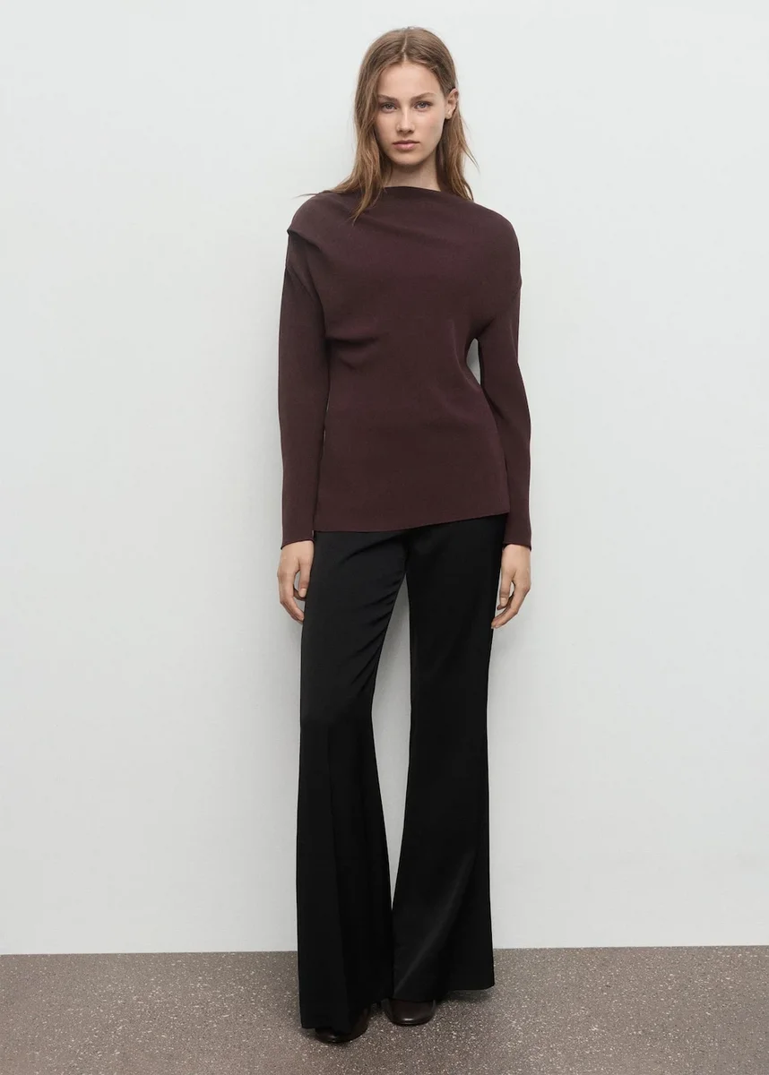 Ta dopasowana bluzka ma asymetryczny dekolt, długie rękawy i marszczone wykończenie na ramionach