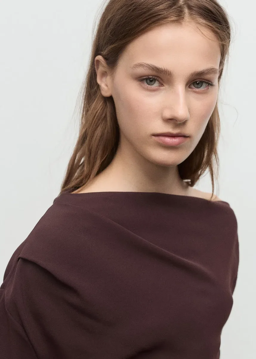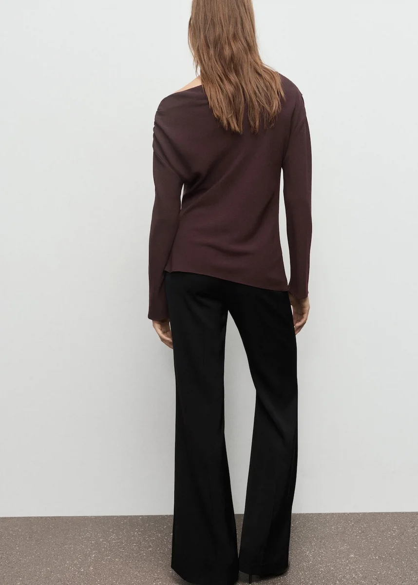 Ta dopasowana bluzka ma asymetryczny dekolt, długie rękawy i marszczone wykończenie na ramieniu.