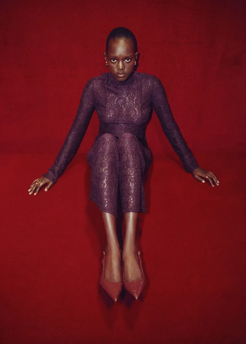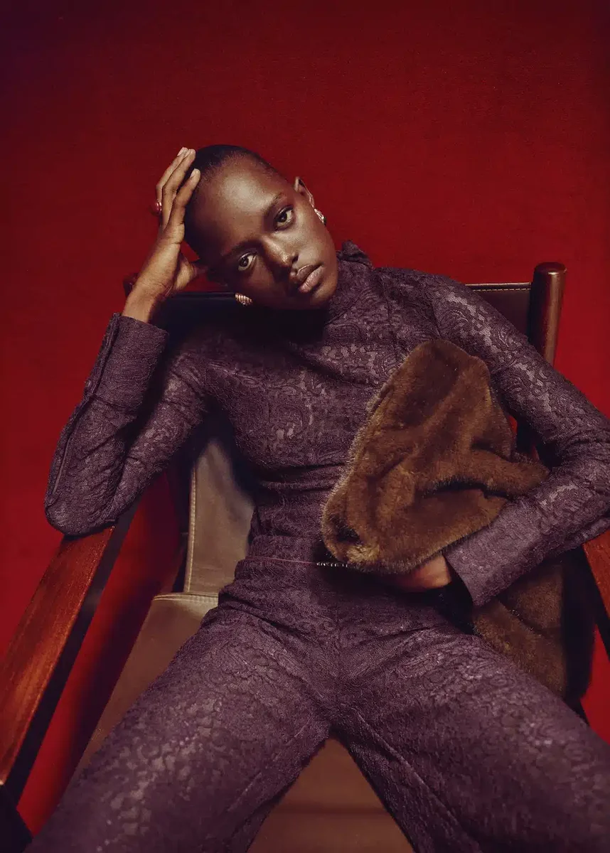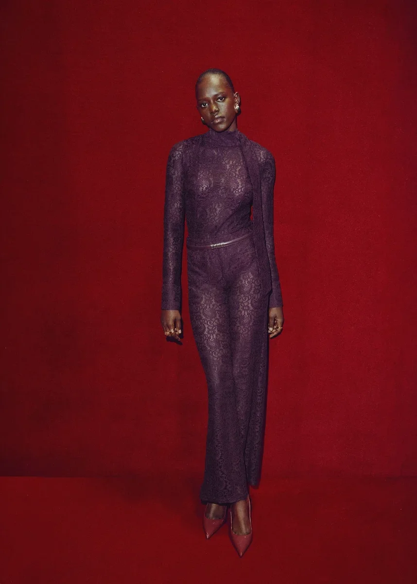 Ta sukienka wykonana z koronki ma prosty krój i wysoki kołnierz ozdobiony szalikiem. Długie rękawy mają mankiety zapinane na guziki, a tył ma elegancki dekolt. W zestawie znajdują się dopasowane spodnie.