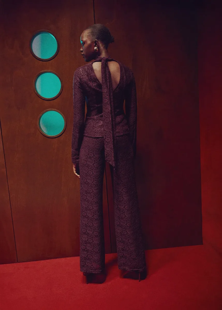Wykonana z koronki, ta bluzka ma prosty krój z wysokim kołnierzem ozdobionym apaszką. Długie rękawy mają mankiety zapinane na guziki, a tył charakteryzuje się eleganckim dekoltem. W zestawie znajdują się dopasowane spodnie.