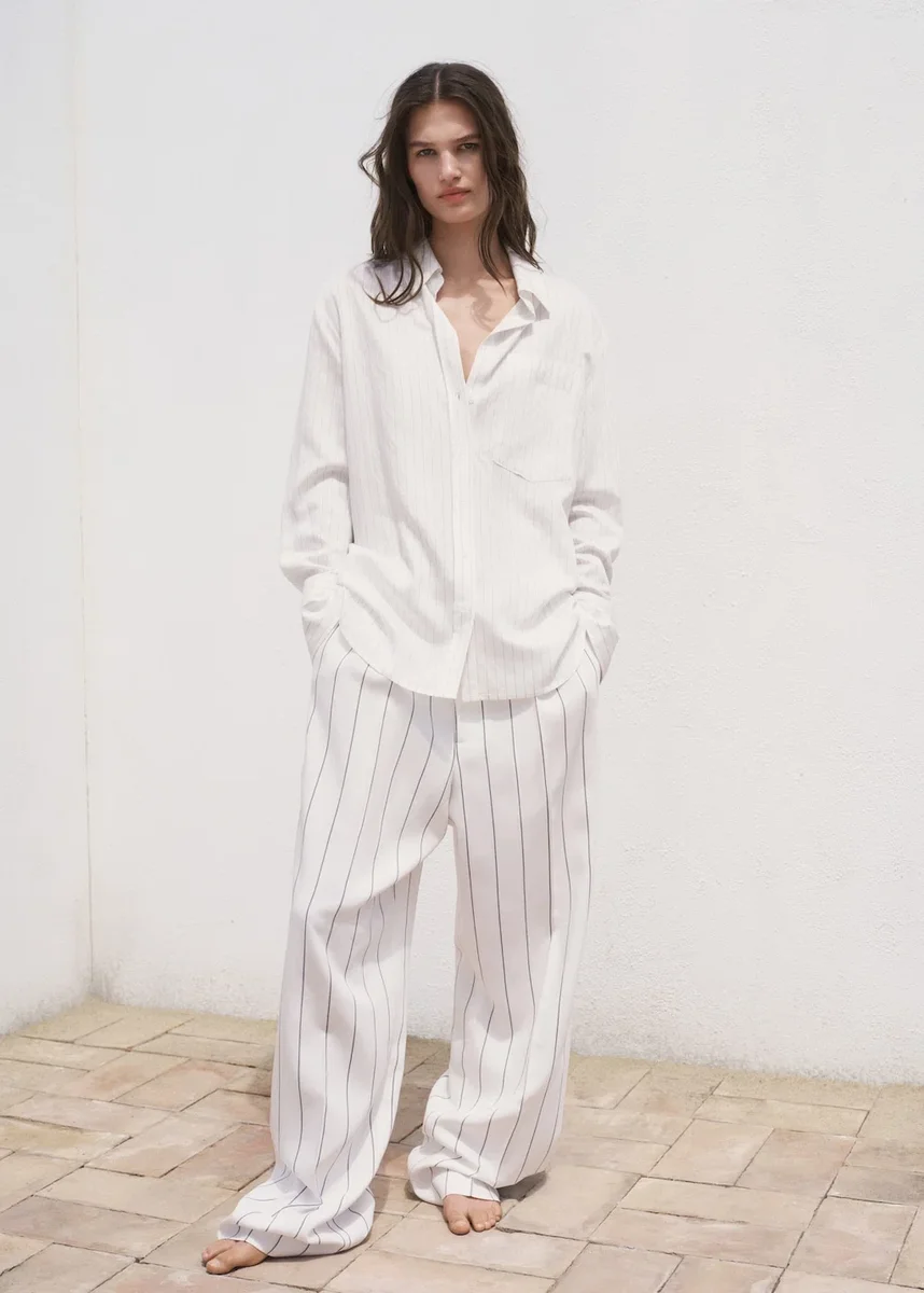 Płynny materiał. Półprzezroczysty wzór. Prosty krój. Nadruk w paski. Kołnierzyk koszulowy. Długie rękawy z mankietami zapinanymi na guziki. Naszywana kieszeń na piersi. Zapięcie na guziki z przodu.