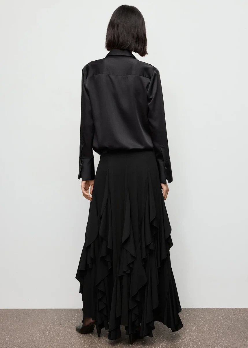 Wykonana z tkaniny o satynowym wykończeniu, ta sukienka ma prosty i elegancki krój. Posiada kołnierzyk koszulowy, długie rękawy z mankietami zapinanymi na guziki oraz zapięcie na guziki z przodu. Dostępna w rozmiarze Plus Size