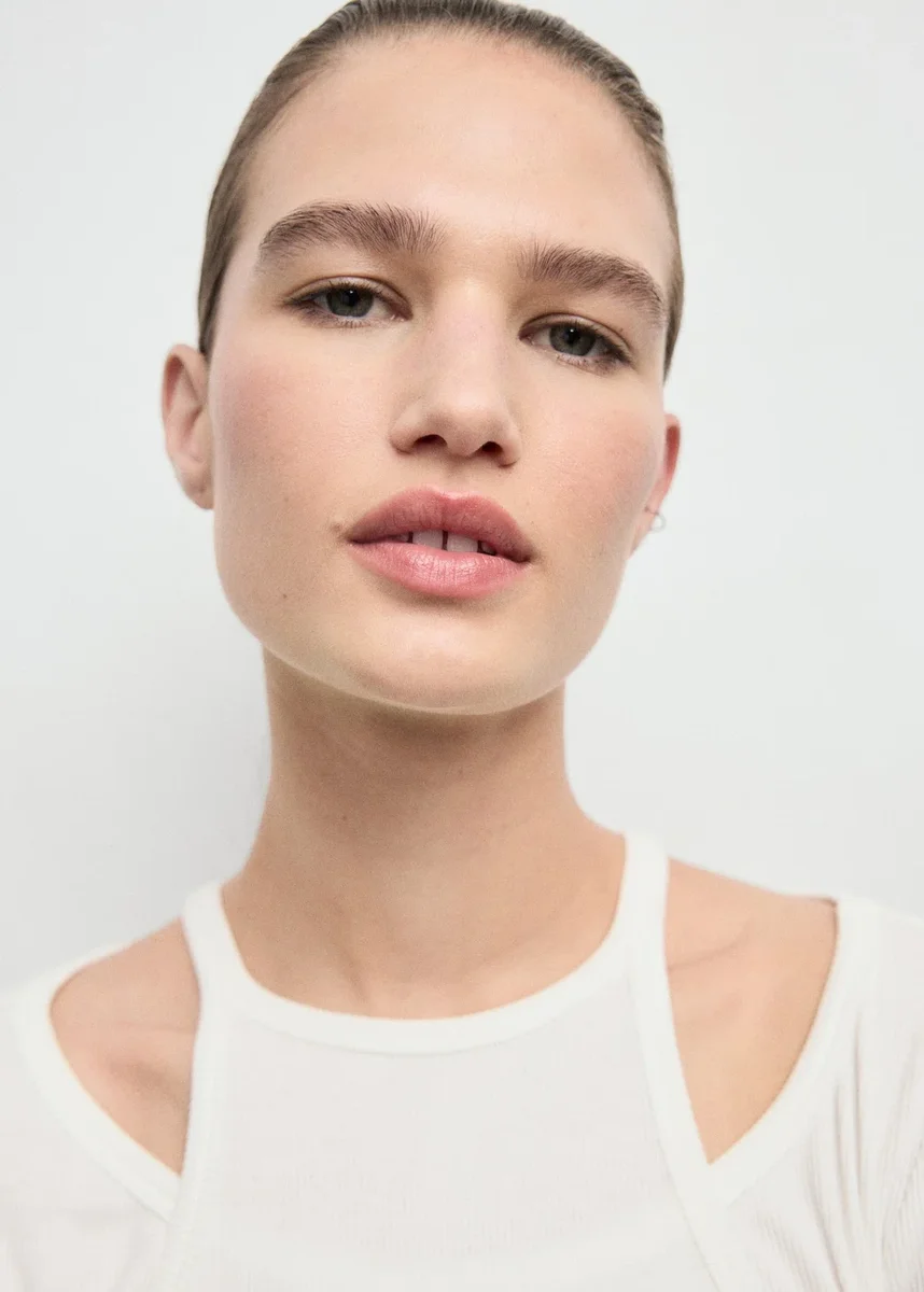 Wykonana z prążkowanej tkaniny, ta odzież charakteryzuje się dopasowanym i połączonym krojem. Posiada dekolt typu halter i długie rękawy.
