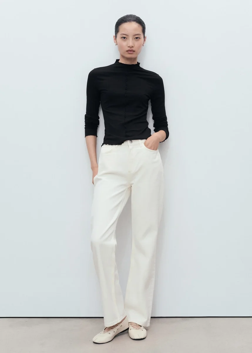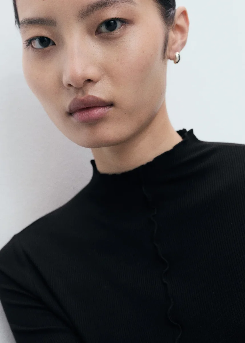 Wykonana z prążkowanej dzianiny, ta koszulka ma dopasowany krój z kołnierzem typu Perkins i długimi rękawami. Posiada szwy i falbany na brzegach.