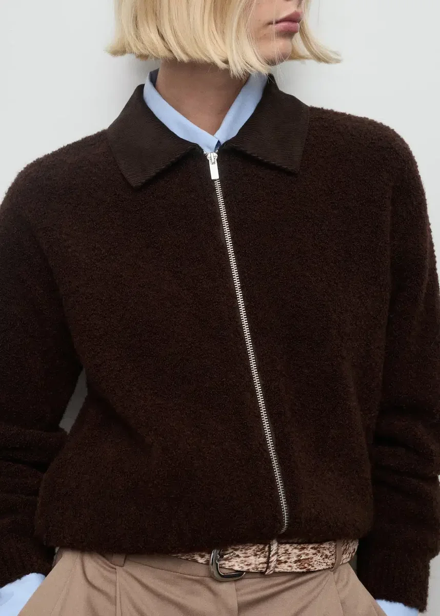 Tkanina bouclé. Styl bomberki. Kołnierzyk koszulowy z sztruksu. Długi rękaw. Zapięcie na zamek błyskawiczny z przodu