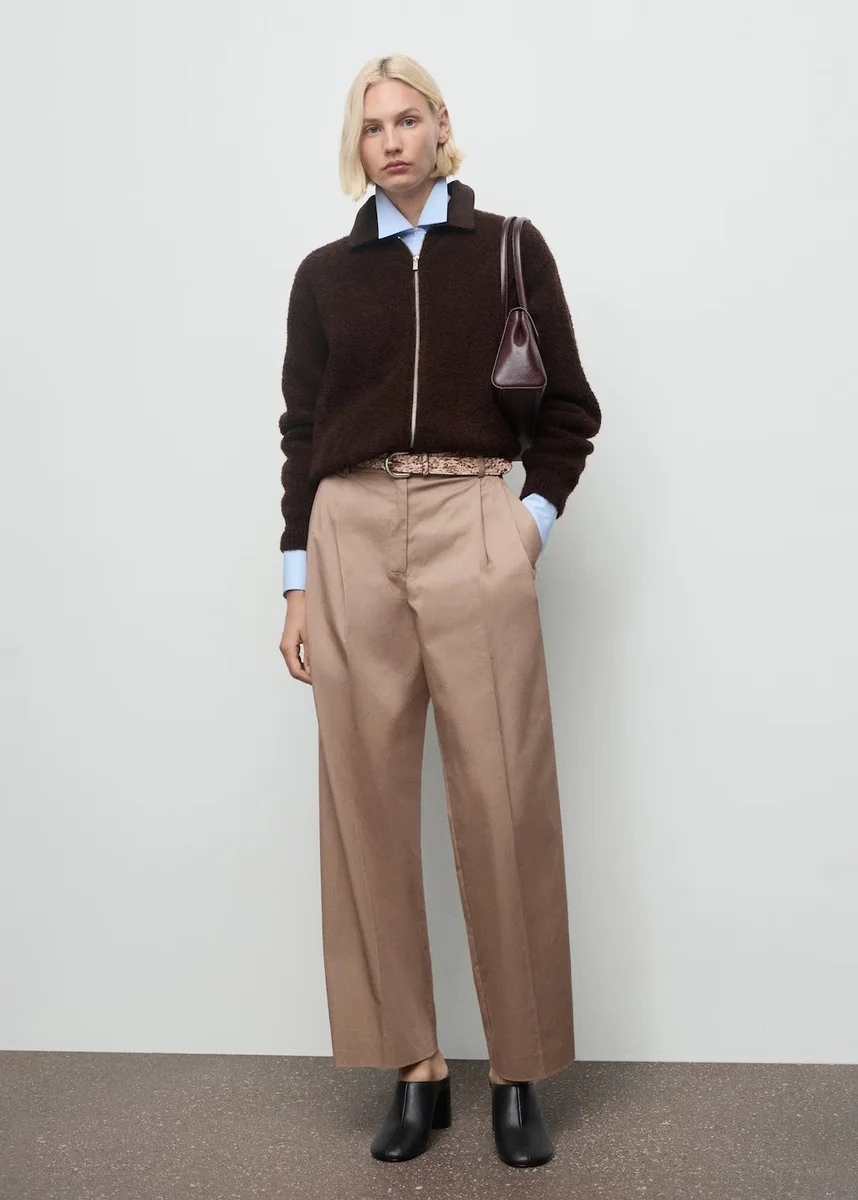 Tkanina bouclé. Krój bomberki. Kołnierzyk koszulowy z sztruksu. Długi rękaw. Zapięcie na zamek błyskawiczny z przodu.