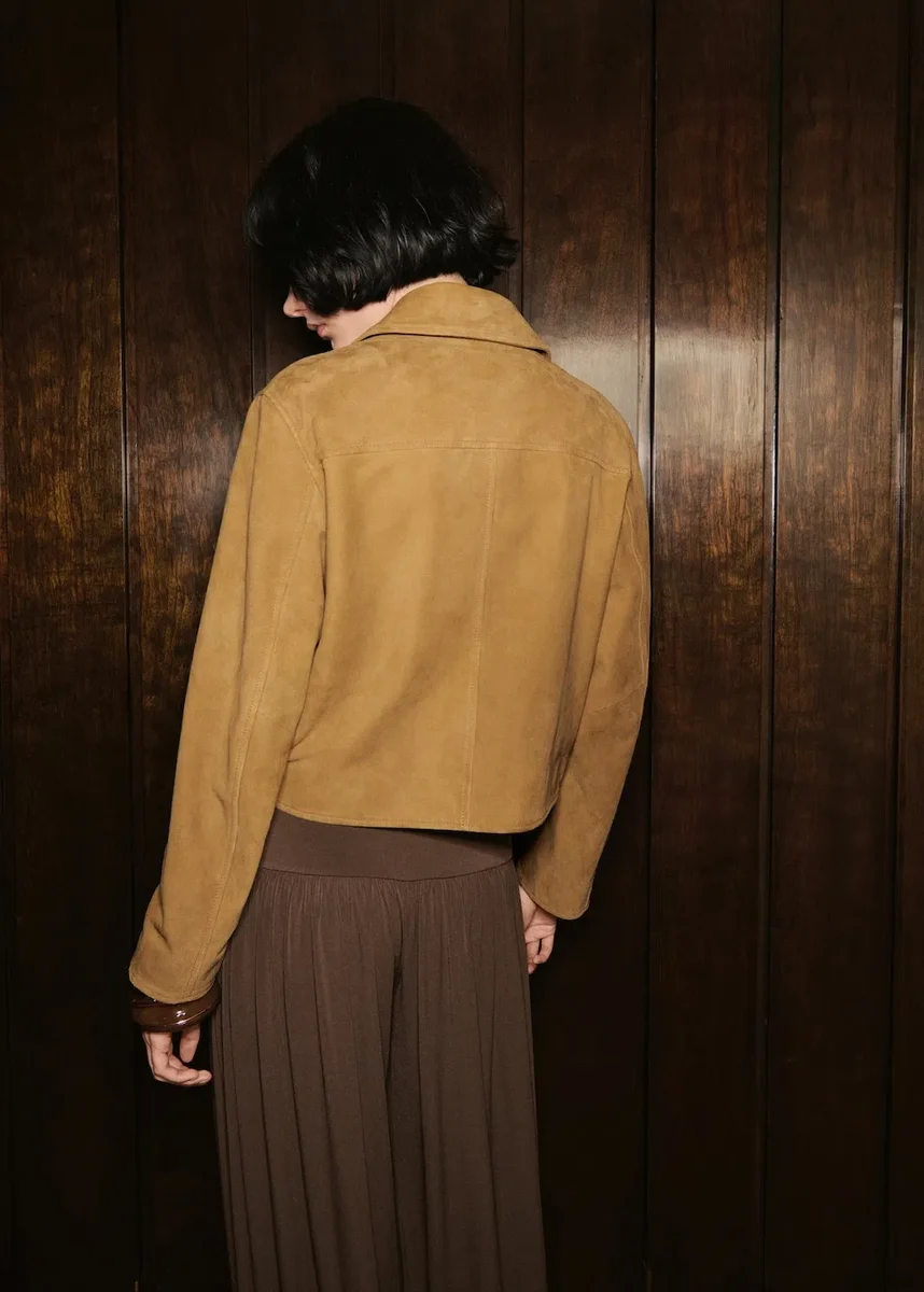 100% skóra koźla. Zamsz. Prosty krój. Kołnierzyk koszulowy. Długi rękaw. Dwie naszywane kieszenie z przodu. Zapięcie na guziki z przodu. Podszewka wewnętrzna.