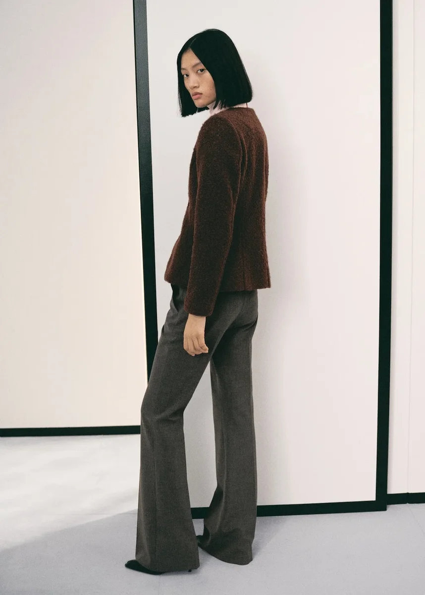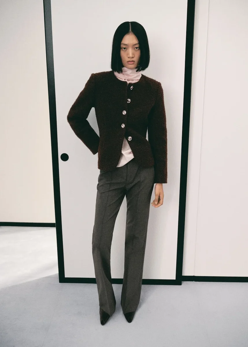 Tkanina bouclé. Dopasowany krój. Okrągły dekolt. Długi rękaw. Guziki z efektem klejnotu. Zapięcie na guziki z przodu. Podszewka wewnętrzna