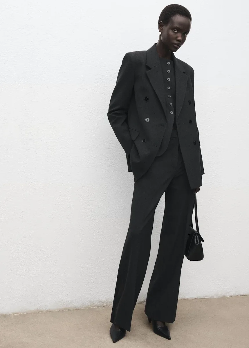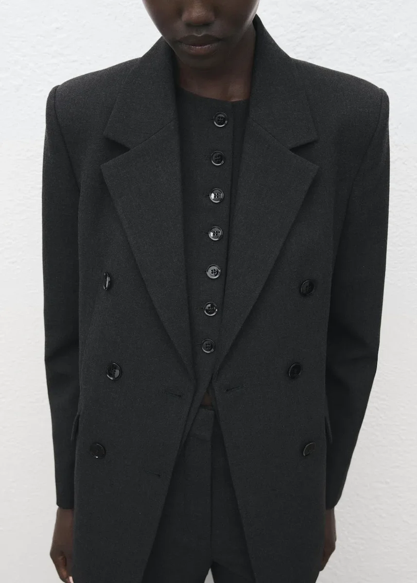 Krój garniturowy. Prosty krój. Kołnierzyk z klapami w kształcie litery V. Klapy z wycięciem. Długie rękawy z mankietami zapinanymi na guziki. Dwie boczne kieszenie z klapkami. Podwójne zapięcie na guziki. Podszewka wewnętrzna. Rozcięcie z tyłu u dołu. Całościowy wygląd.