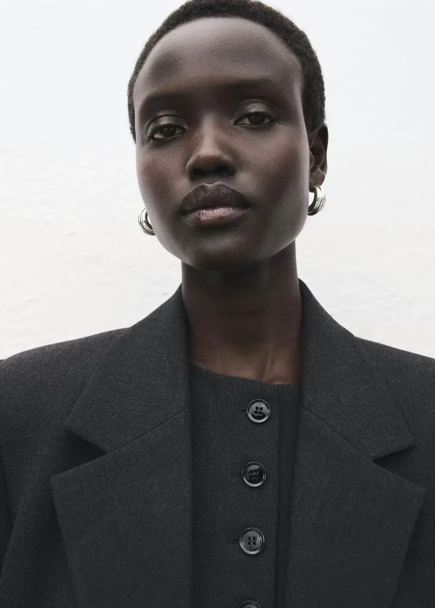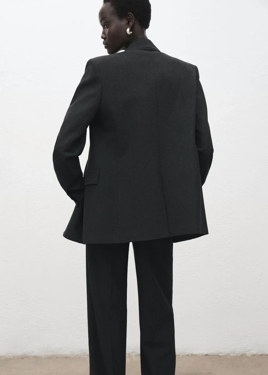Krój garniturowy. Prosty krój. Kołnierzyk z klapami w kształcie litery V. Klapy z wycięciem. Długie rękawy z mankietami zapinanymi na guziki. Dwie boczne kieszenie z klapkami. Podwójne zapięcie na guziki. Podszewka wewnętrzna. Rozcięcie z tyłu u dołu. Całościowy wygląd