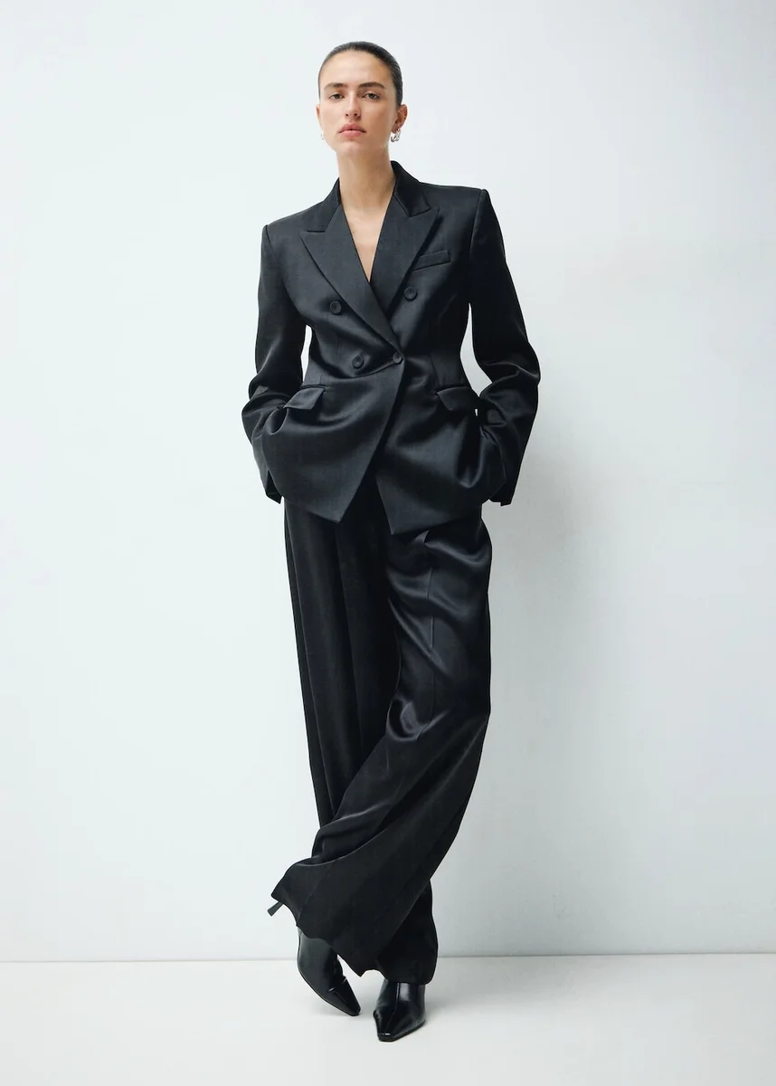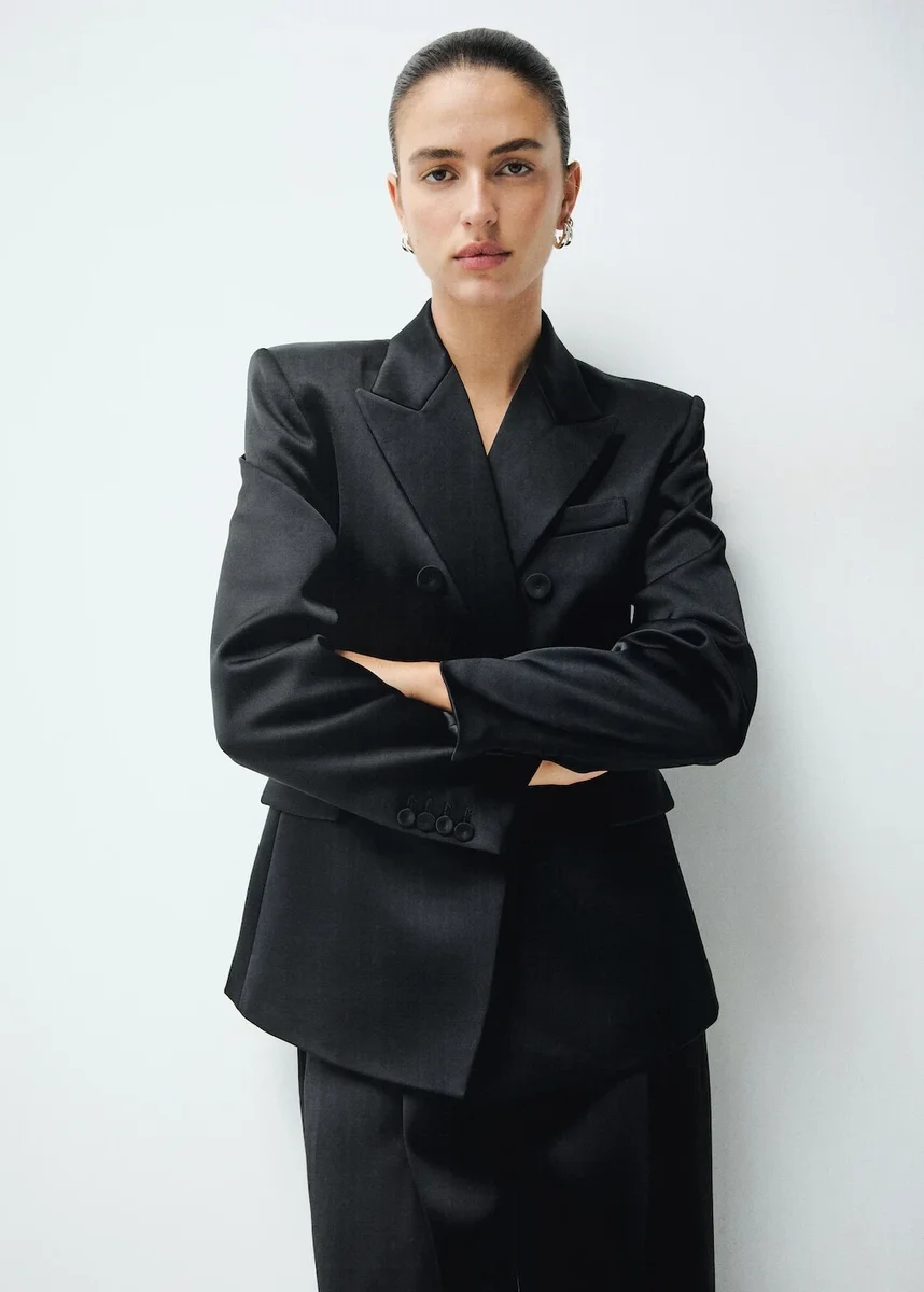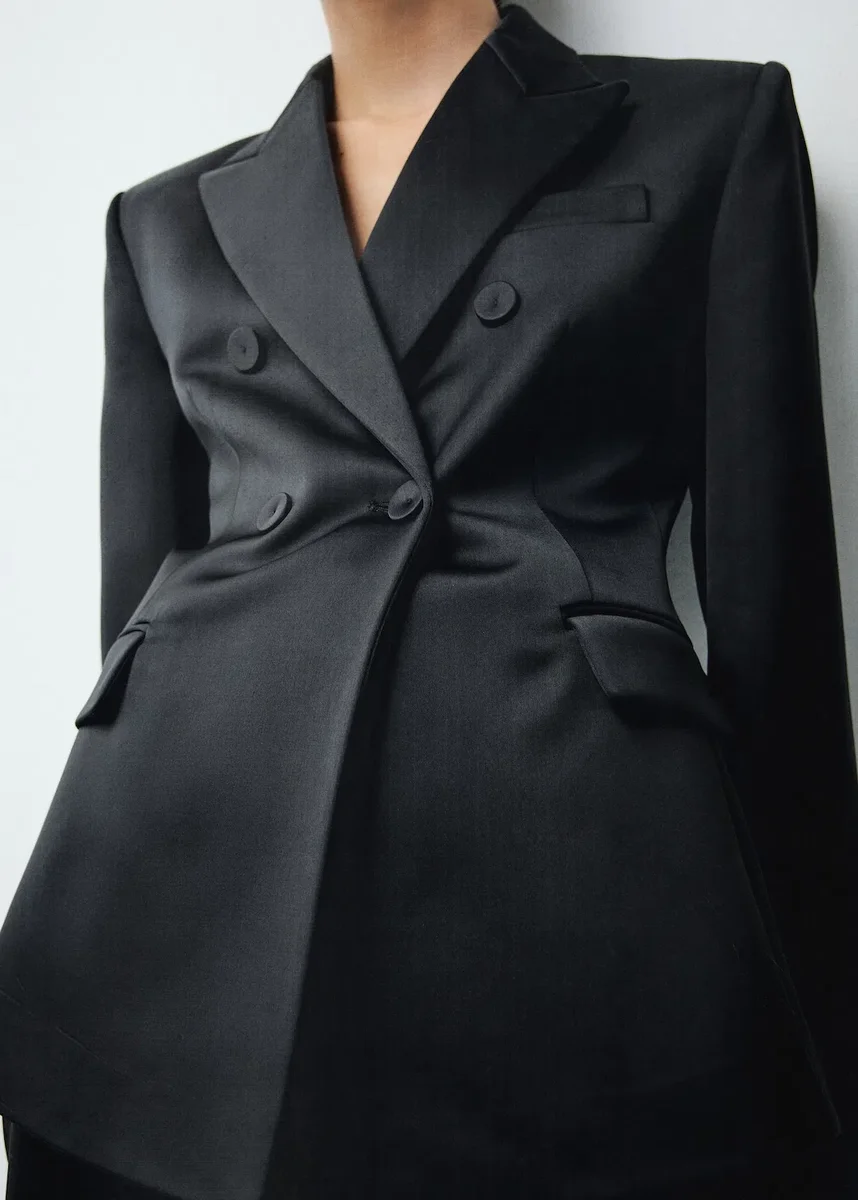 Satynowy splot. Dopasowany krój. Kołnierzyk z klapami w kształcie litery V. Klapy z wycięciem. Długie rękawy z mankietami zapinanymi na guziki. Naszywana kieszeń na piersi. Dwie kieszenie z klapkami z przodu. Podwójne zapięcie na guziki. Podszewka wewnętrzna. Całościowy wygląd. Kolor czarny jest dostępny wyłącznie w sprzedaży internetowej. Ta odzież należy do naszej kolekcji imprezowej i okolicznościowej, zaprojektowanej, aby podkreślić Twój wygląd podczas specjalnych okazji.