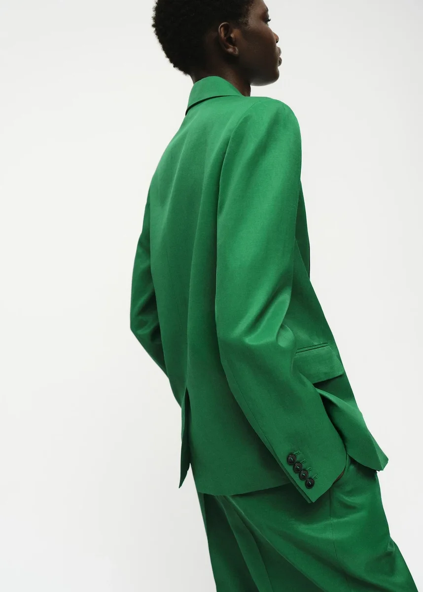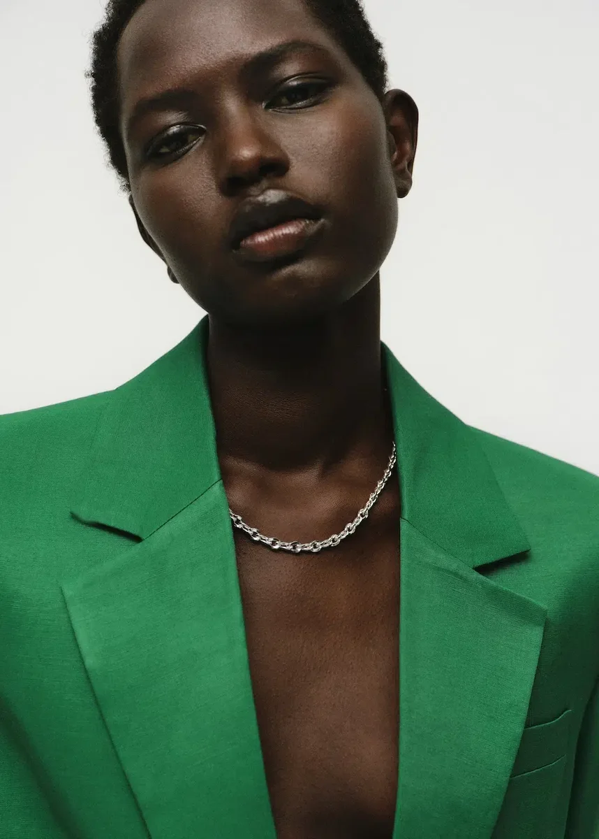 Tkanina z mieszanki lnu. Tkanina o satynowym wykończeniu. Prosty krój. Kołnierzyk z wycięciem. Wycięte klapy. Długie rękawy z mankietami zapinanymi na guziki. Kieszeń na piersi. Dwie kieszenie z klapkami z przodu. Zapięcie na guziki z przodu. Podszewka wewnętrzna. Całościowy wygląd. Ta odzież jest częścią naszej kolekcji eventowej, zaprojektowanej, abyś był idealnym gościem na każdym przyjęciu, weselu lub uroczystości.