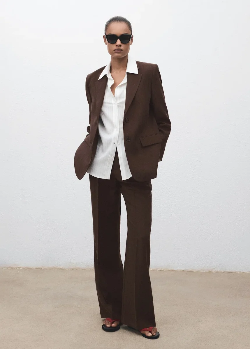 Tkanina lyocell. Prosty krój. Kołnierzyk z klapami w kształcie litery V. Klapy z wycięciem. Długie rękawy z mankietami zapinanymi na guziki. Dwie kieszenie z klapkami z przodu. Zapięcie na dwa guziki z przodu. Podszewka w 100% z bawełny. Całość zestawu. Wyłącznie w sprzedaży internetowej.