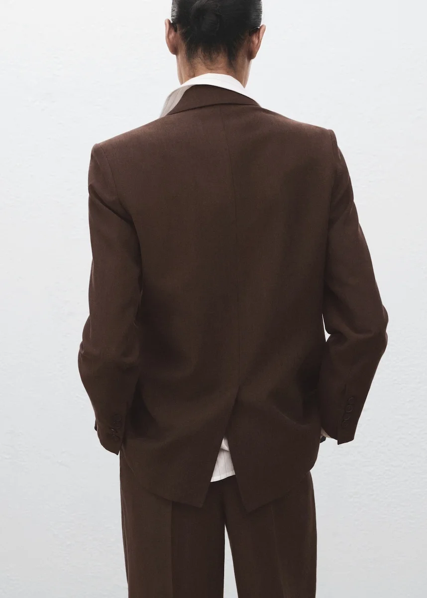 Tkanina lyocell. Prosty krój. Kołnierzyk z klapami w kształcie litery V. Klapy z wycięciem. Długie rękawy z mankietami zapinanymi na guziki. Dwie kieszenie z klapkami z przodu. Zapięcie na dwa guziki z przodu. Podszewka w 100% z bawełny. Całkowicie dopasowany krój. Wyłącznie w sprzedaży internetowej