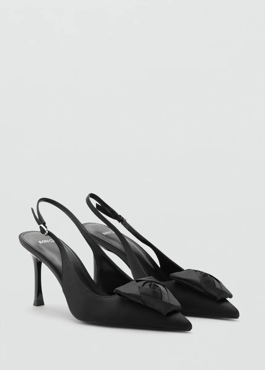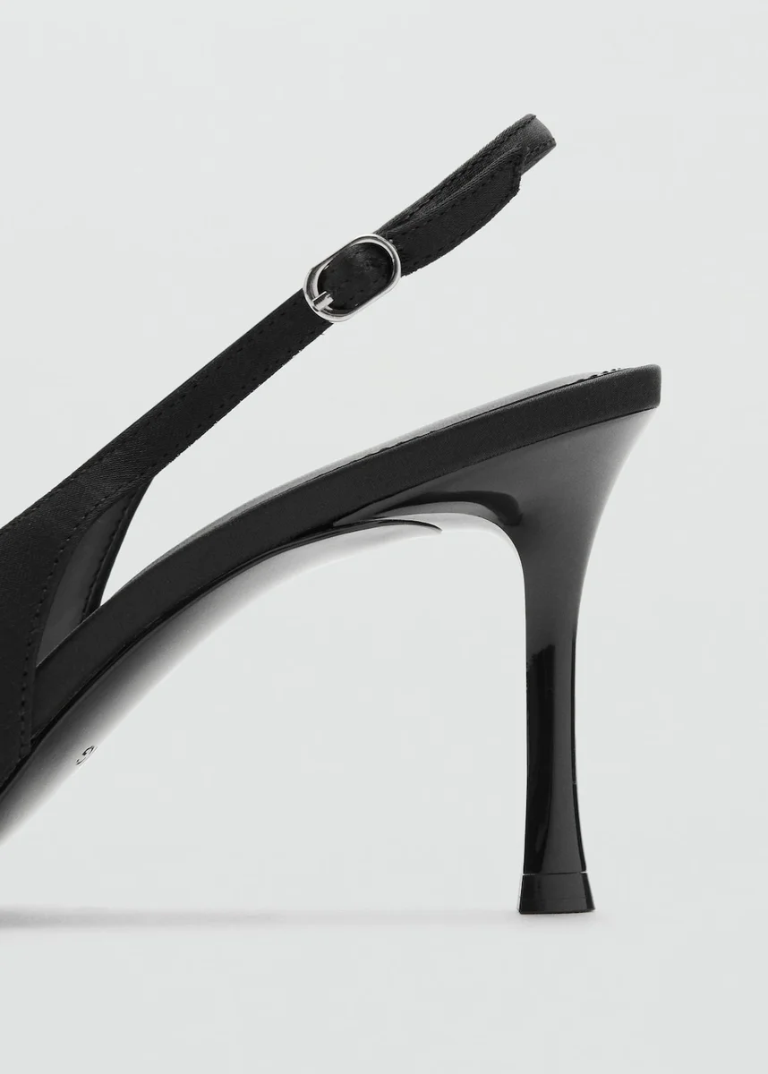 Satynowy splot. Konstrukcja typu slingback. Szpiczasty nosek. Kwiatowy detal. Szpilka. Zapięcie na klamrę przy kostce. Obcas 3,54 cala