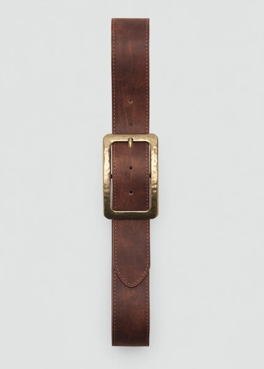 Teksturowany wzór. Kwadratowa metalowa klamra. Szeroki krój. Kwadratowa klamra. Teksturowana klamra.