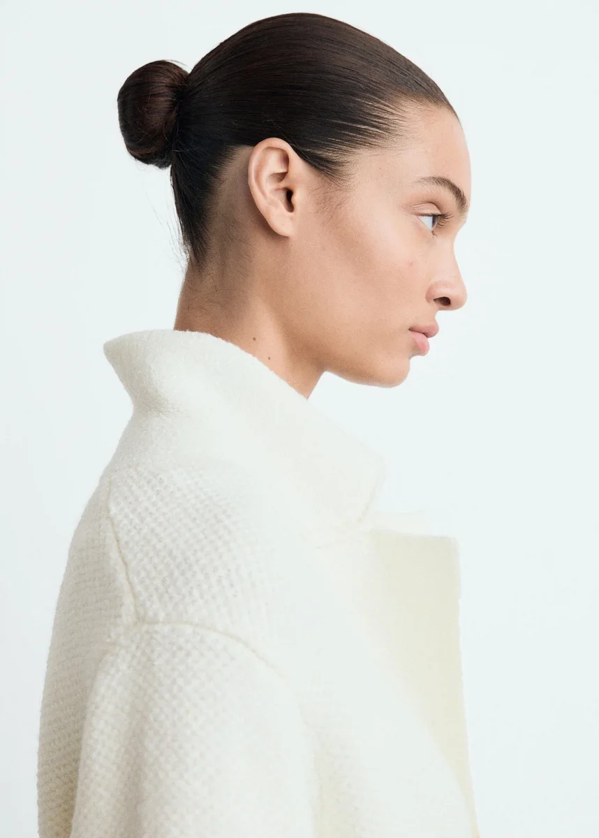 Średnio gruba dzianina. Prosty krój. Długi krój. Dekolt w szpic. Klapy z wycięciem. Długi rękaw. Dwie naszywane kieszenie z przodu. Zapięcie na guziki z przodu. Bez podszewki