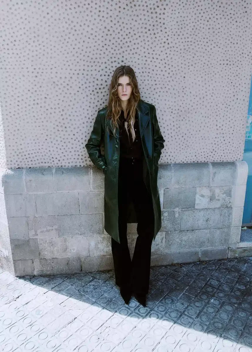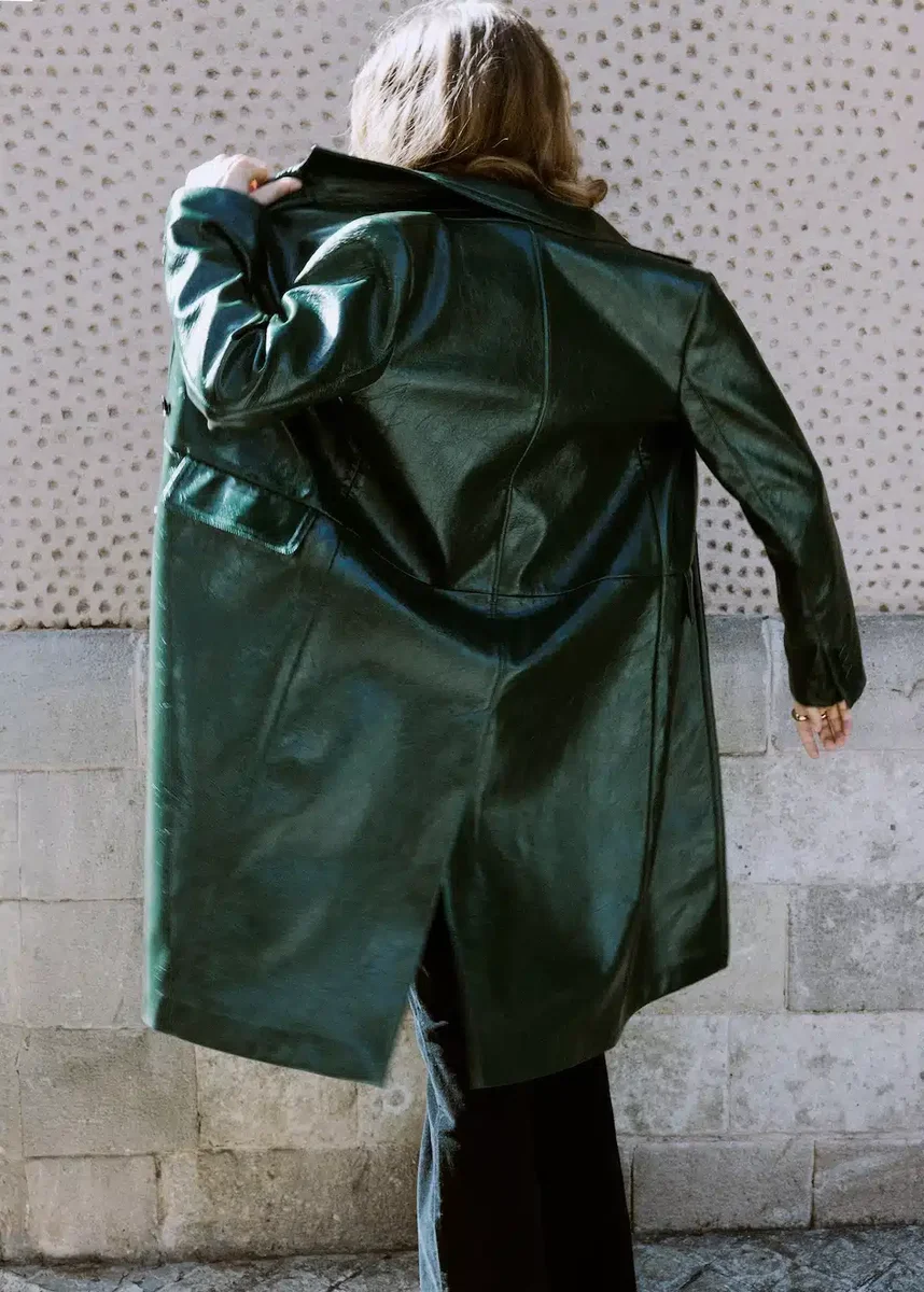 Ten długi płaszcz o prostym kroju, wykonany z tkaniny imitującej skórę, ma elegancki dekolt w kształcie litery V z klapami. Posiada długie rękawy, dwie kieszenie z klapką z przodu i zapięcie na guziki z przodu. Podszewka wewnętrzna
