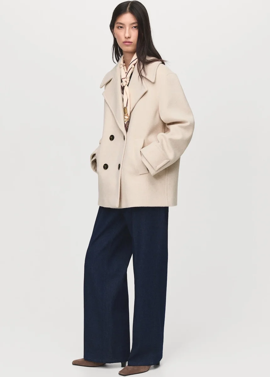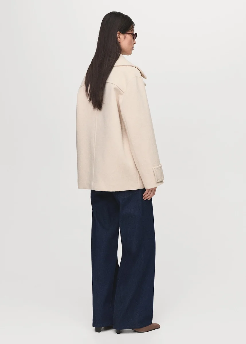 Mieszanka wełny. Fason kopertowy. Prosty krój. Kołnierz z wycięciem. Klapy z wycięciem. Długie rękawy z mankietami zapinanymi na guziki. Dwie kieszenie boczne. Zapięcie z przodu na krzyżowe guziki. Podszewka wewnętrzna.