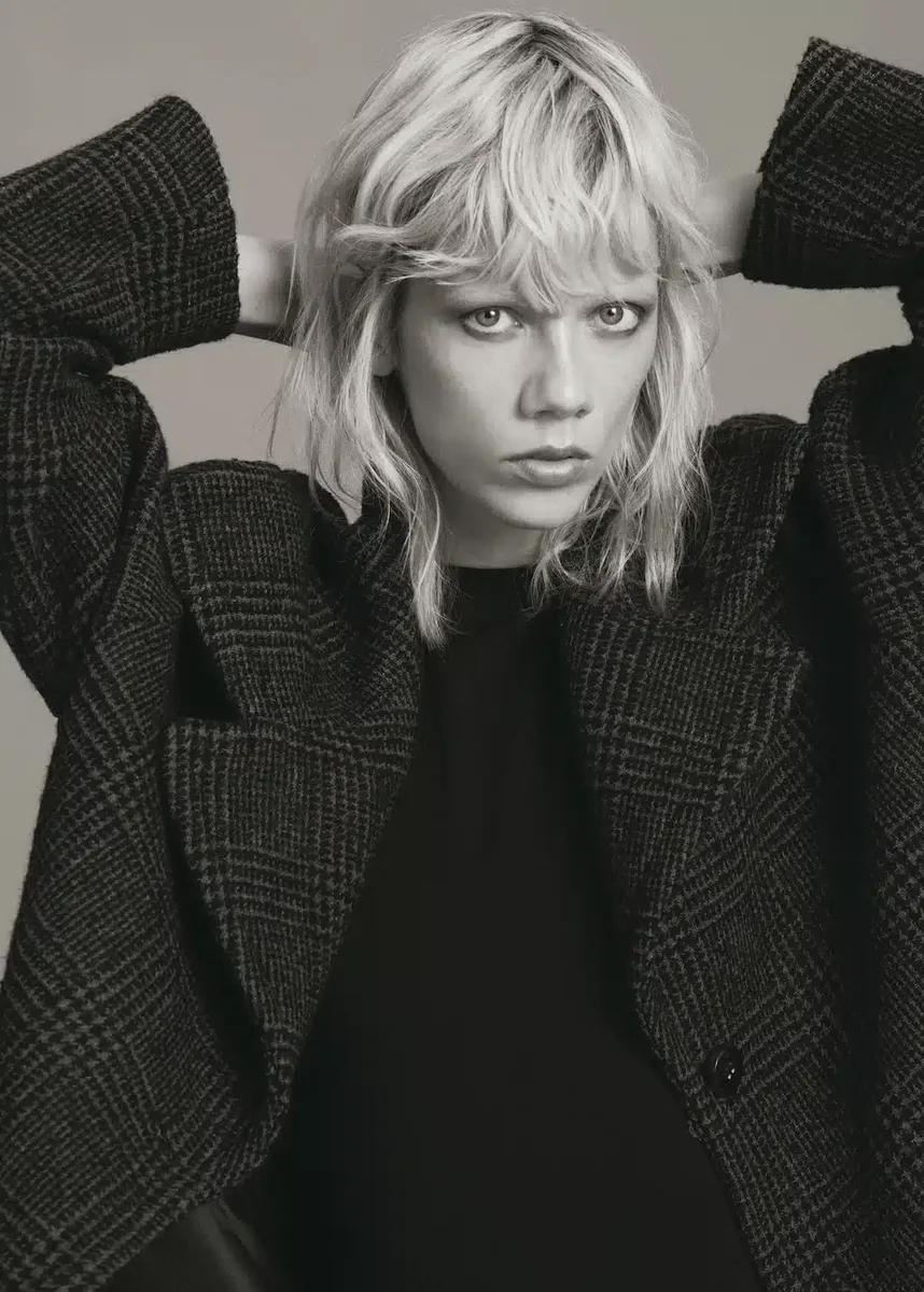 Wykonany z mieszanki wełny, ten oversize’owy model ma wzór w kratę. Posiada kołnierz w kształcie litery V z klapami, długie rękawy, dwie boczne kieszenie i zapięcie na guziki z przodu.