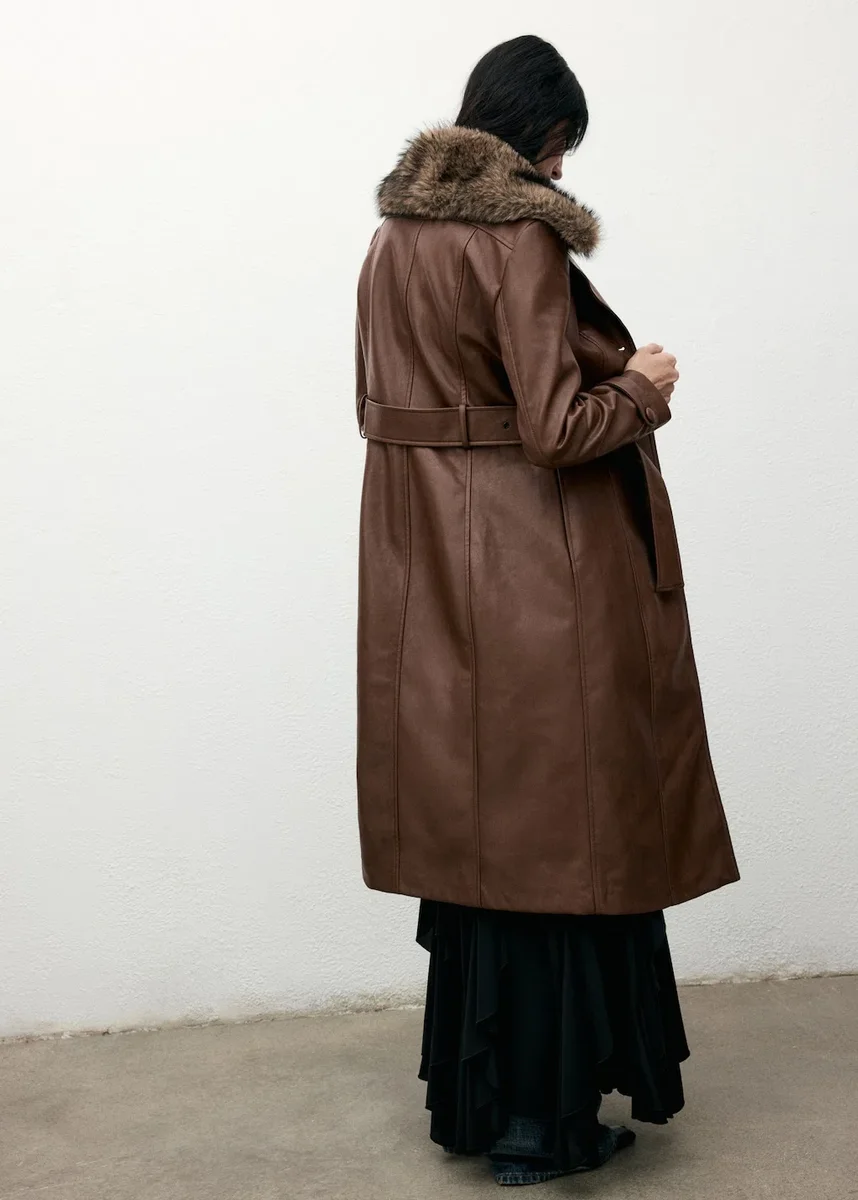 Płaszcz ze sztucznej skóry z futrzanym kołnierzem