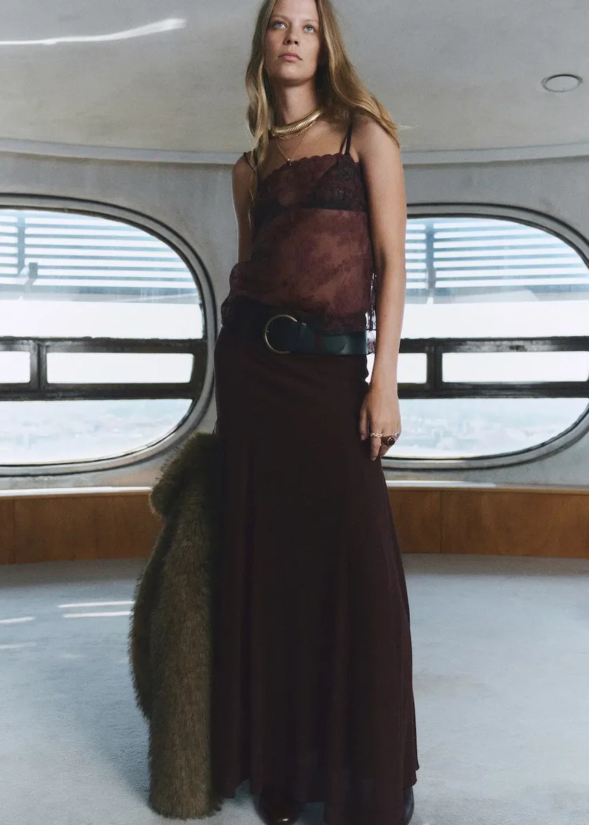 Ten długi model o średniej wysokości talii posiada szlufki i pasek zapinany na klamrę. Posiada godetowe detale i boczny zamek błyskawiczny. Posiada podszewkę wewnętrzną dla większego komfortu. Skład: 100% wiskoza. Podszewka: 100% poliester. Pasek: 85% pvc, 15% poliester. Pranie w pralce w temperaturze maksymalnej 30°C / 85°F, krótkie wirowanie