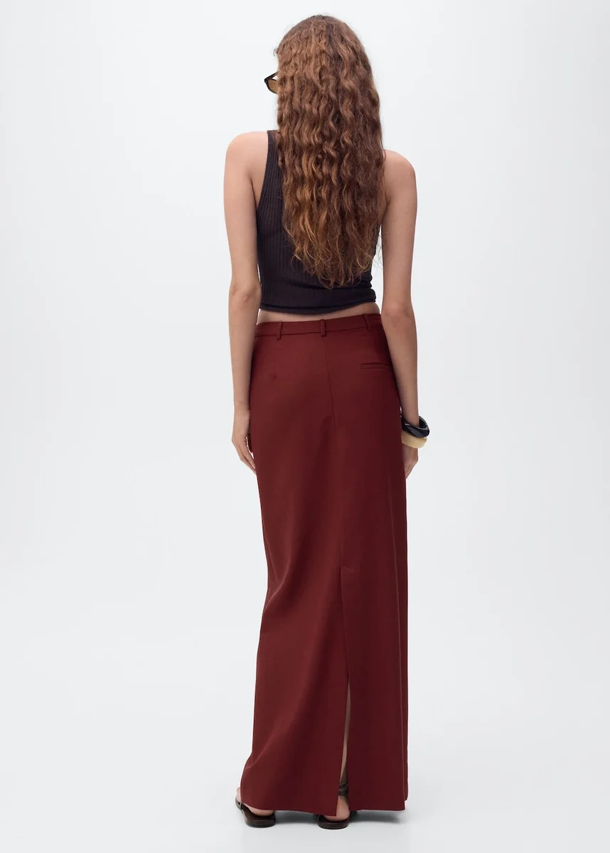 Ta długa spódnica ma prosty krój i wysoki stan. Jej ołówkowa konstrukcja i rozcięcie z tyłu nadają jej charakterystyczny wygląd