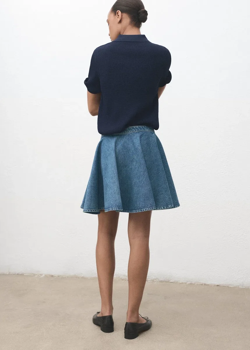 Ta spódnica, wykonana z bawełnianej tkaniny w stylu dżinsowym, ma krótki krój i średni stan. Zamek błyskawiczny z tyłu zapewnia wygodę i praktyczność.