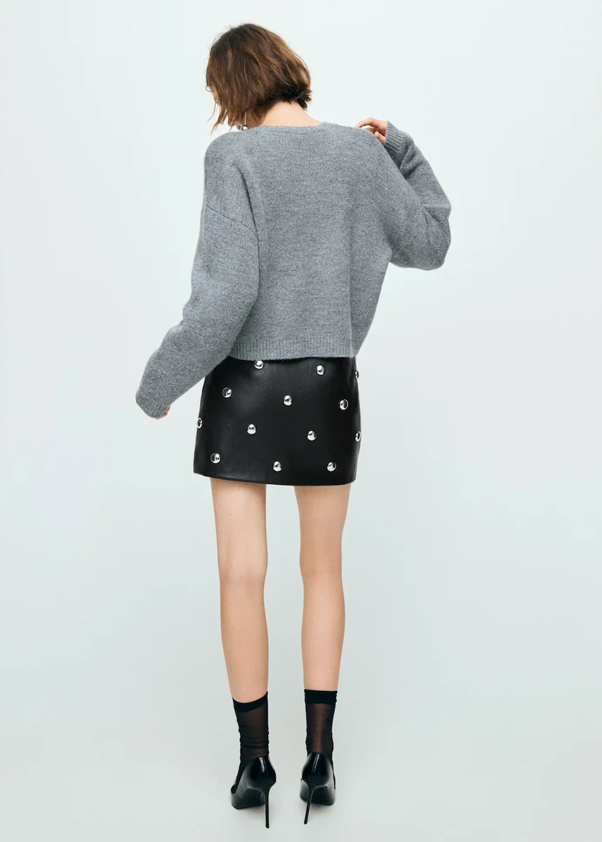 Ta prosta spódnica z imitacji skóry o krótkiej długości wyróżnia się zdobieniami w postaci ćwieków. Posiada boczne zapięcie na zamek błyskawiczny i podszewkę wewnętrzną. Ten produkt należy do naszej kolekcji imprezowej i okolicznościowej, zaprojektowanej z myślą o podkreśleniu Twojego wyglądu podczas specjalnych okazji
