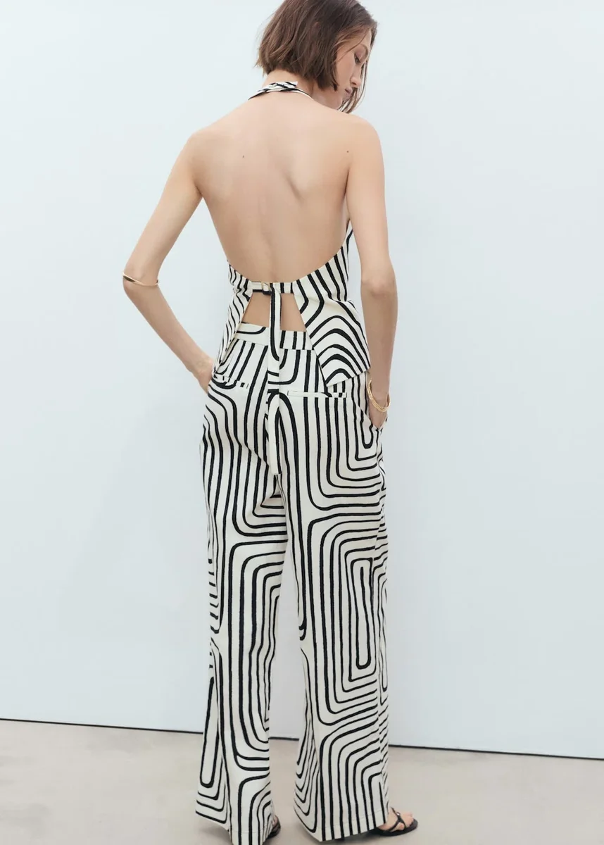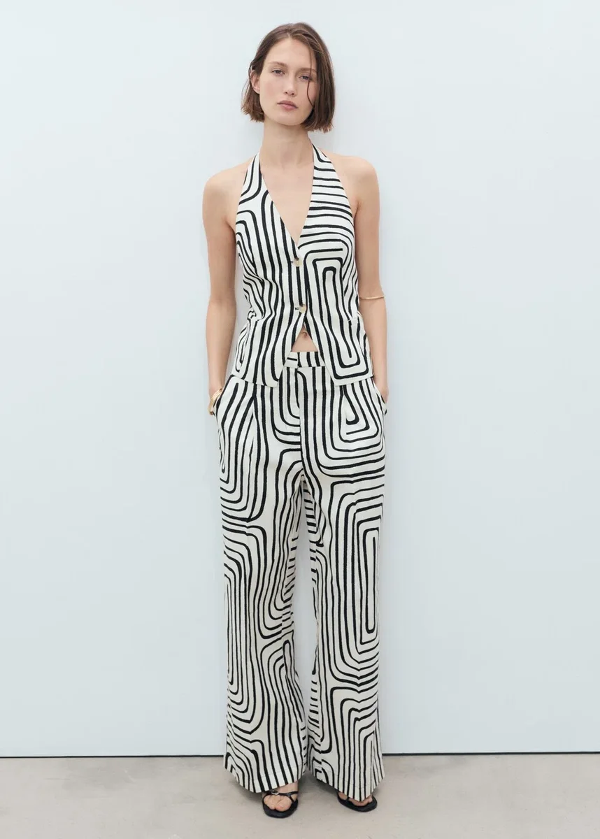 Mieszanka bawełny i lnu. Długi fason. Prosty krój. Geometryczny nadruk. Średni stan. Szlufki. Regulacyjne guziki po bokach. Dwie kieszenie boczne. Dwie kieszenie z tyłu. Ukryte zapięcie na guzik, haczyk i zamek błyskawiczny. Całkowity wygląd. Czarny piątek