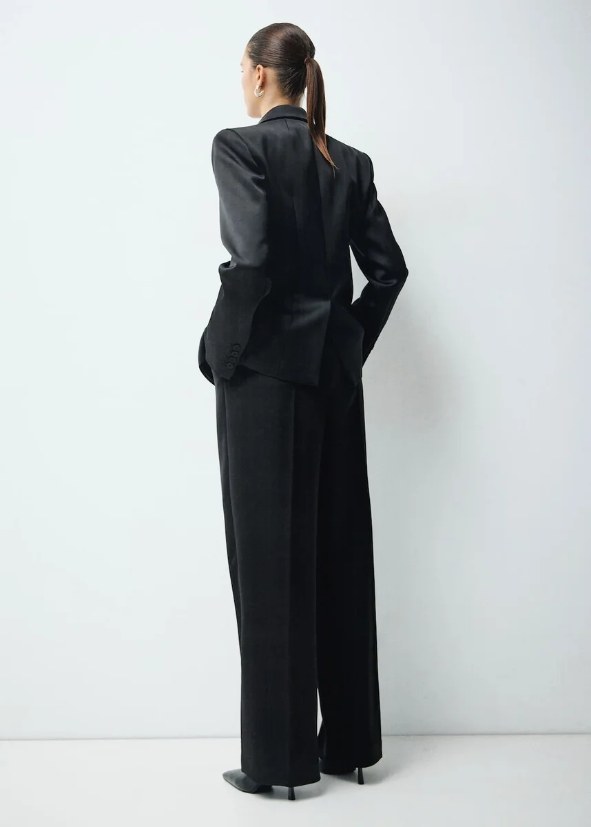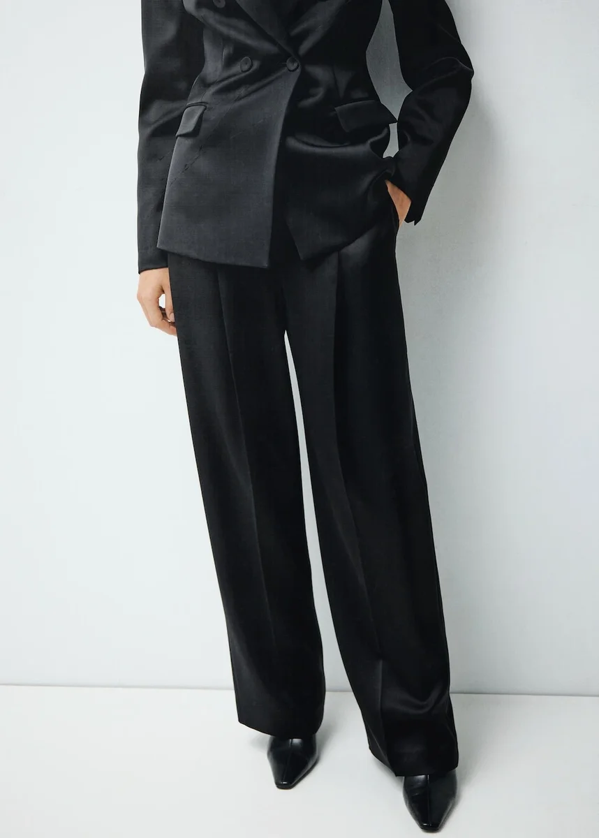 Satynowy splot. Długi krój. Prosty krój. Średni stan. Szlufki. Dwie kieszenie boczne. Dwie kieszenie z tyłu. Plisa z przodu. Ukryte zapięcie na guziki, haczyki i zamek błyskawiczny. Całościowy wygląd. Kolor czarny jest dostępny wyłącznie w sprzedaży internetowej. Ten produkt należy do naszej kolekcji na imprezy i uroczystości, zaprojektowanej z myślą o podkreśleniu Twojego wyglądu podczas specjalnych okazji. 17% poliester
